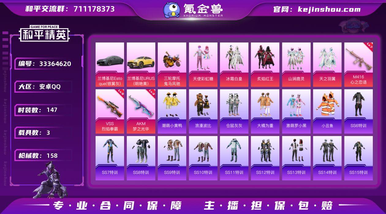 安卓 【精品小号 粉装-天使彩虹糖/套装-小丑鱼/M416-心之恋语(七级)/VSS-烈焰拳霸(五级)/兰博基尼Estoque(银翼灰)/兰博基尼URUS(明艳黄)/甜心宝贝背包】手Q-5粉装-4特效枪-3载具-2粉色飞行器-54818热力值-12王牌印记-147套装-158枪皮 【热门品类】:套装-小丑鱼,套装-潮萌小黄鸭,套装-浪漫波比 【粉色套装】:粉装-天使彩虹糖,粉装-冰霜白皇,粉装-炙焰红王,粉装-山涧鹿灵,粉装-天之羽翼 【粉色枪皮等级】:AKM-梦之光华(三级),M416-心之恋语(七级),VSS-烈焰拳霸(五级),Mk14-福马献瑞(三级) 【粉色载具】:兰博基尼Estoque(银翼灰),兰博基尼URUS(明艳黄),鬼马风驰 【粉色枪皮】:AKM-梦之光华,M416-心之恋语,VSS-烈焰拳霸,Mk14-福马献瑞 【粉色飞行器】:古堡领主飞行器,天之羽翼飞行器 【粉色降落伞】:甜心宝贝降落伞,炫紫旋律降落伞,神秘黑猫降落伞,甜蜜誓约降落伞,心之恋语降落伞,夏日绵绵冰降落伞,暗夜玫瑰降落伞,海渊国主降落伞,蓝莓炮弹降落伞,天之羽翼降落伞,环太平洋降落伞 【稀有套装】:套装-马上有钱 【稀有枪皮】:AKM-夜灯,AKM-彩虹符号,AKM-恐龙拽拽,AKM-星之彼岸,AKM-灼热熔岩,AKM-萌趣颜团子,AKM-虎虎生威,AKM-阿狸...