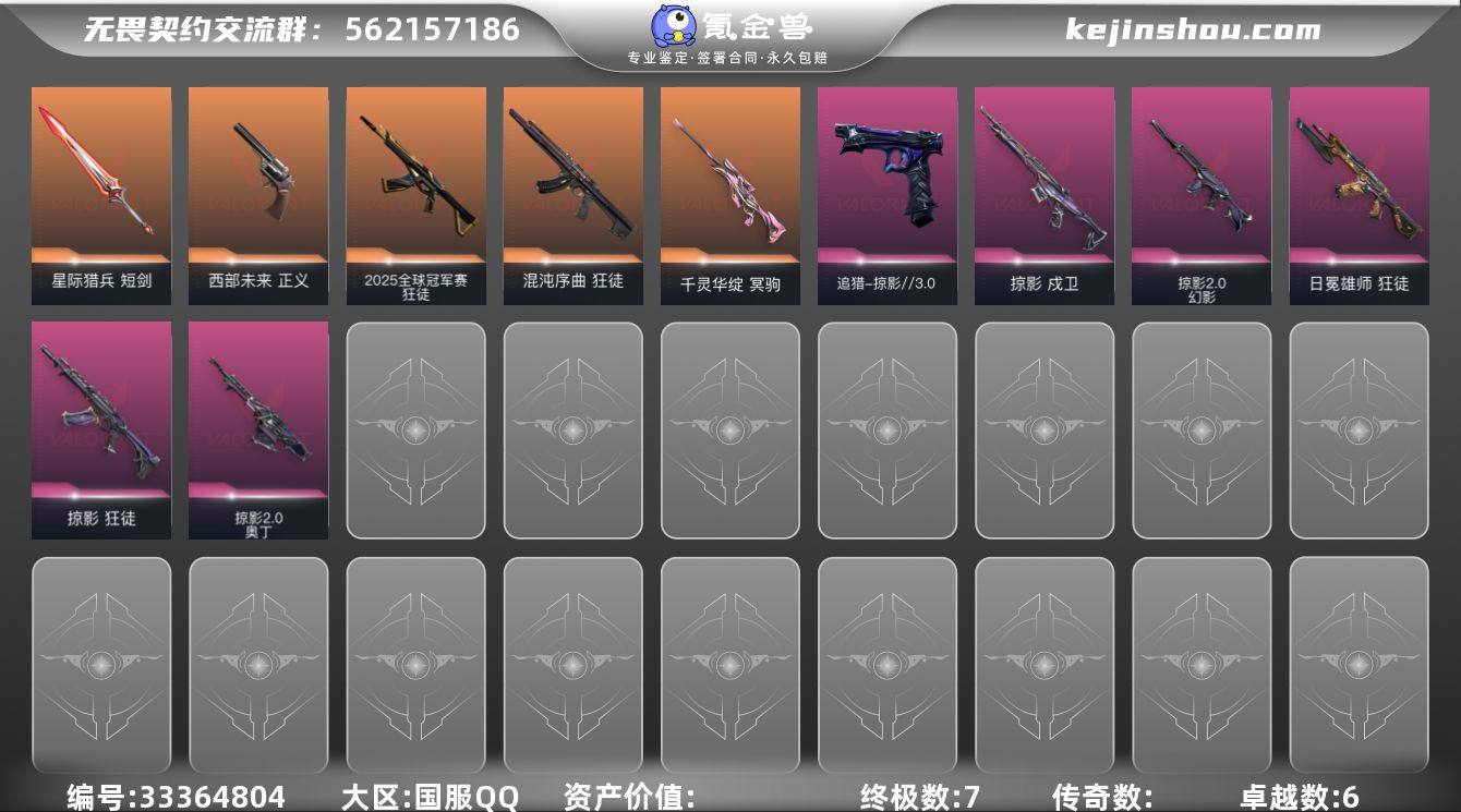 【WWYH450】LV等级73/皮肤总价值18180/段位青铜/总皮肤数量44/刀皮数量2/枪皮数量42/套装数量2/具体详情请看图/回火礼包:掠影套装/掠影//3.0套装/幻棱/炼狱/维斯/暮蝶/钛狐/壹决/捷风/幽影/不死鸟/贤者/猎枭/蝰蛇/芮娜/尚勃勒/霓虹/夜露/K/O/盖可/黑梦/近战武器-影蝶/星际猎兵 短剑/2025全球冠军赛 狂徒/狂徒-混沌序曲/狂徒-掠影/狂徒-日冕雄师/幻影-掠影2.0/戍卫-掠影/冥驹-千灵华绽/奥丁-掠影2.0/骇灵-无限竞技/追猎-掠影//3.0/正义-西部未来/西装暴徒 卡面/无畏契约GO!第一卷:芮娜 卡面/无畏契约GO!第一卷:零 卡面/代号红色 卡面/新兵报到 卡面/V契约 卡面/无畏契约 卡面/买装还是存钱 喷漆/胜利属于无畏契约 喷漆/GLHF 喷漆/无畏契约 喷漆/天外飞客 挂饰/无畏契约 纪念币 挂饰