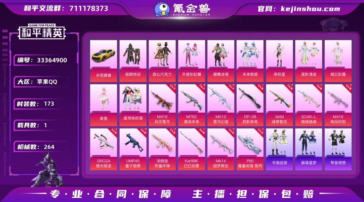 满级地铁苹果 手Q-10粉装-14特效枪-1载具-8粉色飞行器-85828热力值-15王牌印记-173套装-264枪皮 【热门品类】:套装-浪漫天命,套装-龟仙人,套装-糯粉咩咩,角色-Mark.06 【粉色套装】:粉装-极限特训,粉装-甜心巧克力,粉装-天使彩虹糖,粉装-蝶舞迷情,粉装-未来歌姬,角色-茉莉星,粉装-莲影清波,角色-烟云彩露,角色-美雪,粉装-星穹咏叹调 【粉色枪皮等级】:AKM-绿萝繁花(五级),SCAR-L-锦绣绵绵(五级),M416-风花雪月(七级),M416-电玩时刻(五级),GROZA-镜光银凌(五级),M762-激战未来(七级),UMP45-量子极限(五级),汤姆逊-热量炸弹(五级),AKS-74U-森灵之息(五级),P90-魔童闹海 敖丙(三级),Kar98K-巳巳如意(五级),Mk14-甜梦熊击(五级),MK12-雪月幻音(七级),DP-28-豹影疾电(五级) 【粉色载具】:永恒黄蜂 【粉色枪皮】:AKM-绿萝繁花,SCAR-L-锦绣绵绵,M416-风花雪月,M416-电玩时刻,GROZA-镜光银凌,M762-激战未来,UMP45-量子极限,汤姆逊-热量炸弹,AKS-74U-森灵之息,P90-魔童闹海 敖丙,Kar98K-巳巳如意,Mk14-甜梦熊击,MK12-雪月幻音,DP-28-豹影疾电 【粉色飞行器】:炫彩糖果飞行器,齐天大圣飞行器,天之羽翼飞行器,萌物绒绒飞行器,繁龙极客飞...