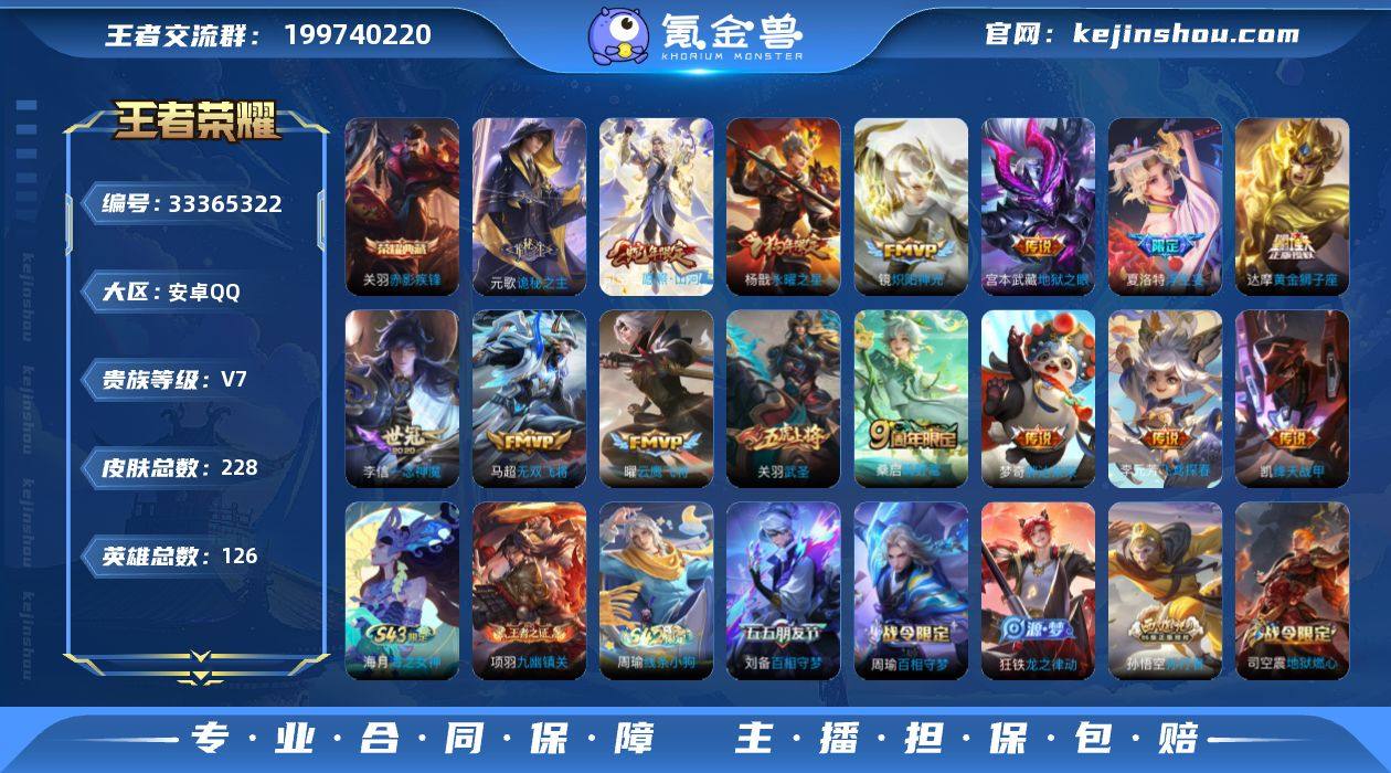 安卓Q-V1-最强王者段位-125英雄-227皮肤-1典藏皮肤-15传说-67史诗 【英雄全皮】:猪八戒全皮,夏洛特全皮,司空震全皮,戈娅全皮 【荣耀典藏】:关羽赤影疾锋 【传说皮肤】:元歌诡秘之主,司空震愿照山河定,桑启鸣野蒿,夏洛特浮生妄,马超无双飞将,李元芳飞鸢探春,铠绛天战甲,镜炽阳神光,关羽武圣,曜云鹰飞将,李信一念神魔,达摩黄金狮子座,梦奇胖达荣荣,杨戬永曜之星,宫本武藏地狱之眼 【限定皮肤】:大乔绒语心约,姜子牙天穹之誓,狄仁杰阴阳师,赵云皇家上将,吕布御风骁将,元歌云间偶戏,狄仁杰魔术师,达摩沙漠行僧,项羽海滩派对,老夫子圣诞老人,关羽武圣,兰陵王金庭之子,孙悟空孙行者,刘备百相守梦,李元芳云中旅人,杨戬永曜之星,干将莫邪胡桃夹子,雅典娜黎明之约,鬼谷子五谷丰年,苏烈千军破阵,百里玄策原初追逐者,梦奇顽趣,沈梦溪大漠名商,裴擒虎李小龙,裴擒虎擒涛扼浪,狂铁电玩高手,猪八戒西部大镖客,猪八戒猪悟能,嫦娥拒霜思,嫦娥暖冬兔眠,西施玲珑珍味,鲁班大师探海日志,桑启海盐诗旅,夏洛特浮生妄,暃星界游侠,戈娅驭风魔法,艾琳流音漫舞,司空震地狱燃心,阿古朵江河有灵,张良古海寻踪,蒙恬荣光圣徽,鬼谷子天穹祈灯...