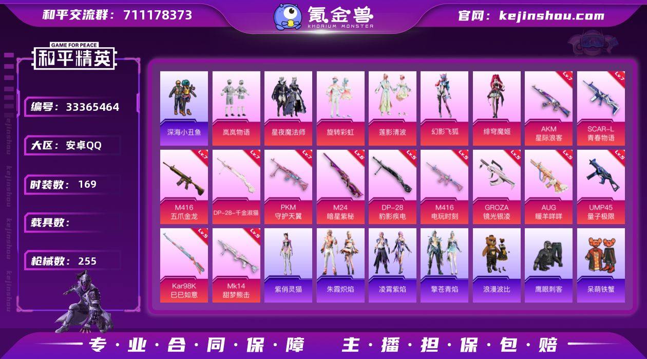【kyhp1848】安卓 手Q-6粉装-13特效枪-0载具-6粉色飞行器-85752热力值-17王牌印记-169套装-255枪皮 【热门品类】:绝对防御上衣,套装-浪漫天命,套装-深海小丑鱼,套装-龟仙人,套装-暗影哥特,套装-浪漫波比,套装-粉红小猪 【粉色套装】:粉装-岚岚物语,粉装-星夜魔法师,粉装-旋转彩虹,粉装-莲影清波,粉装-幻影飞狐,角色-绯穹魔姬 【粉色枪皮等级】:AKM-星际浪客(七级),SCAR-L-青春物语(七级),M416-五爪金龙(七级),M416-电玩时刻(五级),GROZA-镜光银凌(五级),AUG-暖羊咩咩(五级),UMP45-量子极限(五级),Kar98K-巳巳如意(五级),M24-暗星紫秘(六级),Mk14-甜梦熊击(五级),DP-28-千金淑猫(七级),DP-28-豹影疾电(五级),PKM-守护天翼(七级) 【粉色枪皮】:AKM-星际浪客,SCAR-L-青春物语,M416-五爪金龙,M416-电玩时刻,GROZA-镜光银凌,AUG-暖羊咩咩,UMP45-量子极限,Kar98K-巳巳如意,M24-暗星紫秘,Mk14-甜梦熊击,DP-28-千金淑猫,DP-28-豹影疾电,PKM-守护天翼 【粉色飞行器】:炫彩糖果飞行器,歌者泠鸢飞行器,繁龙极客飞行器,星空武士飞行器,月下星之子飞行器,时光之誓飞行器 【粉色降落伞】:天之羽翼降落伞,冷魅冰骑降落伞,筑梦精灵降落伞,甜...