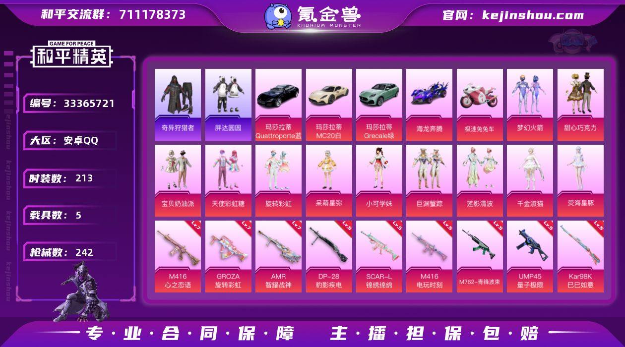 【kyhp1859】安卓 手Q-11粉装-10特效枪-5载具-3粉色飞行器-91829热力值-15王牌印记-213套装-242枪皮 【热门品类】:粉装-梦幻火箭,套装-浪漫天命,套装-小丑鱼,套装-奇异狩猎者,套装-胖达圆圆,套装-黄金大亨,套装-金羽特工,套装-龟仙人,套装-暗影哥特,角色-Mark.06 【粉色套装】:粉装-甜心巧克力,粉装-宝贝奶油派,粉装-天使彩虹糖,粉装-梦幻火箭,粉装-旋转彩虹,角色-呆萌星弥,角色-小可学妹,粉装-巨渊蟹踪,粉装-莲影清波,角色-千金淑猫,角色-荧海星豚 【粉色枪皮等级】:M16A4-垂柳戏鸭(一级),SCAR-L-锦绣绵绵(五级),M416-心之恋语(七级),M416-电玩时刻(五级),GROZA-旋转彩虹(七级),M762-青锋波束(五级),UMP45-量子极限(五级),Kar98K-巳巳如意(五级),AMR-智耀战神(七级),DP-28-豹影疾电(五级) 【粉色载具】:玛莎拉蒂MC20(星石白),玛莎拉蒂Quattroporte(夜幕蓝),玛莎拉蒂Grecale(薄荷绿),海龙奔腾,极速兔兔车,僚机-萌兔起飞 【粉色枪皮】:M16A4-垂柳戏鸭,SCAR-L-锦绣绵绵,M416-心之恋语,M416-电玩时刻,GROZA-旋转彩虹,M762-青锋波束,UMP45-量子极限,Kar98K-巳巳如意,AMR-智耀战神,DP-28-豹影疾电 【粉色飞行器】:炫彩糖果...