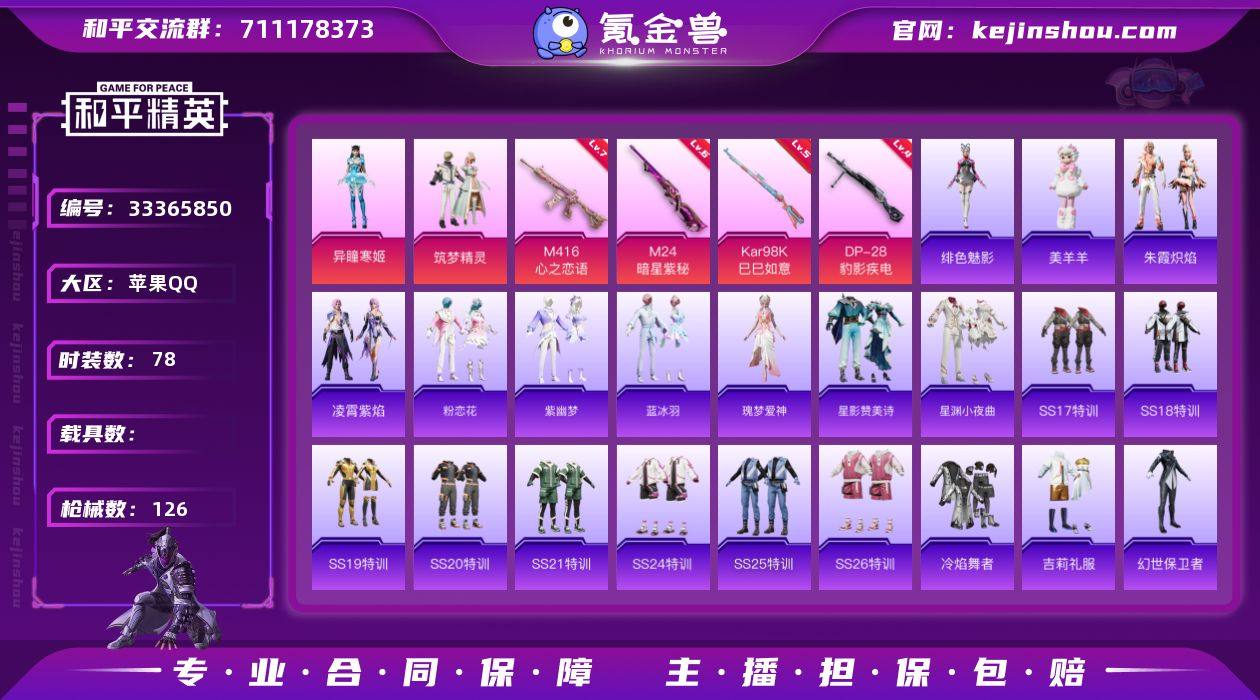 苹果 手Q-2粉装-4特效枪-0载具-1粉色飞行器-38209热力值-10王牌印记-78套装-126枪皮 【粉色套装】:粉装-筑梦精灵,角色-异瞳寒姬 【粉色枪皮等级】:M416-心之恋语(七级),Kar98K-巳巳如意(五级),M24-暗星紫秘(六级),DP-28-豹影疾电(四级) 【粉色枪皮】:M416-心之恋语,Kar98K-巳巳如意,M24-暗星紫秘,DP-28-豹影疾电 【粉色飞行器】:炫彩糖果飞行器 【粉色降落伞】:洛神天依降落伞,风花雪月降落伞,暗星紫秘降落伞,筑梦精灵降落伞,旋转彩虹降落伞,智耀战神降落伞,星穹咏叹调降落伞,异瞳寒姬降落伞,炫彩糖果降落伞,罪夜之冕降落伞 【稀有套装】:套装-粉恋花,套装-紫幽梦,套装-蓝冰羽,角色-瑰梦爱神,套装-星影赞美诗,套装-星渊小夜曲,套装-朱霞炽焰,套装-凌霄紫焰,玩偶服-美羊羊,角色-绯色魅影 【稀有枪皮】:AKM-奇异狩猎者,AKM-彩虹符号,AKM-王牌投手,AKM-生命誓言,AKM-霓虹街区,M16A4-幻世战舞者,M16A4-甜心亚梦,SCAR-L-夜灯,SCAR-L-流星咚咚,SCAR-L-炫彩节奏,SCAR-L-玉兔迎春,SCAR-L-红色方程式,M416-暗星紫秘,M416-神秘黑猫,M416-红色方程式,GROZA-异彩先驱,GROZA-紫翼圣骑,AUG-流星咚咚,QBZ-飞驰魅影,M762-彩虹符号,M762-...