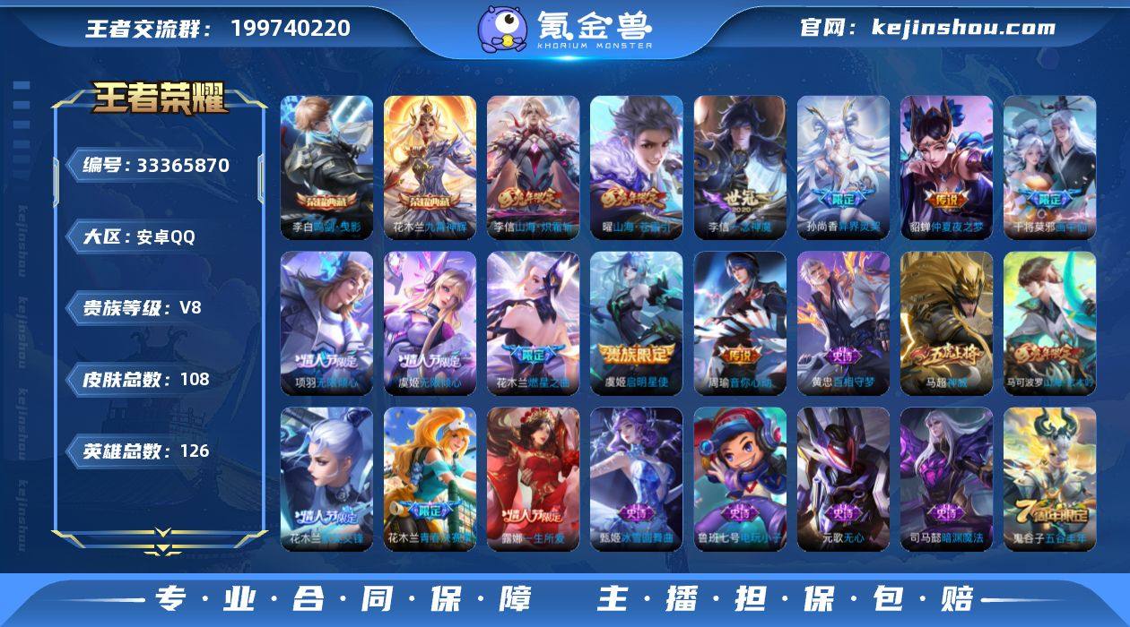 TD2641108无二次安卓Q-V8-尊贵铂金III段位-126英雄-108皮肤-2典藏皮肤-11传说-32史诗 【荣耀典藏】:李白鸣剑曳影,花木兰九霄神辉 【传说皮肤】:干将莫邪画中仙,花木兰燃星之曲,虞姬无限倾心,项羽无限倾心,曜山海苍雷引,李信山海炽霜斩,孙尚香异界灵契,周瑜音你心动,虞姬启明星使,李信一念神魔,貂蝉仲夏夜之梦 【限定皮肤】:狄仁杰阴阳师,赵云皇家上将,嬴政优雅恋人,孙尚香异界灵契,元歌无心,马可波罗山海玄木吟,狄仁杰魔术师,狄仁杰万华元夜,达摩沙漠行僧,项羽海滩派对,项羽无限倾心,老夫子醍醐杖,程咬金演武夺筹,露娜一生所爱,韩信逐梦之影,兰陵王金庭之子,花木兰青春决赛季,花木兰默契交锋,花木兰燃星之曲,李元芳云中旅人,虞姬启明星使,虞姬无限倾心,钟馗驱傩正仪,干将莫邪画中仙,鬼谷子原初探秘者,鬼谷子五谷丰年,苏烈千军破阵,沈梦溪大漠名商,裴擒虎擒涛扼浪,米莱狄御霄,李信山海炽霜斩,曜山海苍雷引,鲁班大师探海日志,桑启海盐诗旅,张良古海寻踪,鬼谷子天穹祈灯 【年限皮肤】:曜山海苍雷引,李信山海炽霜斩,马可波罗山海玄木吟 【赛季限定】:米莱狄御霄,老夫子醍醐杖,鬼谷子原初探秘者,狄仁杰万华元夜,程咬金演...