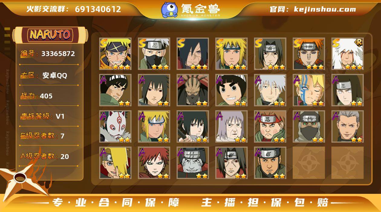 【HYYT464】VIP等级V1/战力405W/S忍数量7/A忍数量20/二星A-日向宁次·忍界大战/二星A-我爱罗「疾风传」/二星A-宇智波鼬/三星S-旗木卡卡西「须佐能乎」/2星小南「神驹佑将」/三星S-佩恩「天道」/三星S-漩涡鸣人·宇智波佐助/二星A-角都「地怨虞」/三星S-波风水门/二星A-秋道丁次「忍界大战」/二星A-漩涡博人「桃式显现」/二星A-李洛克「忍界大战」/二星A-神秘面具男 「忍者之路」/二星A-波风水门 「青年」/二星A-蝎「绯流琥」/三星S-自来也「舞之豪杰」/二星A-飞段/二星A-猿飞阿斯玛/二星A-宇智波泉奈/二星A-迪达拉/二星A-旗木卡卡西 「幻之真容」/二星A-干柿鬼鲛/三星S-宇智波斑「秽土转生·解」/二星A-迈特凯「青春爆炸」/二星A-宇智波佐助「须佐能乎」/二星A-千代「近松十人卫」/三星S-宇智波鼬 「须佐能乎」