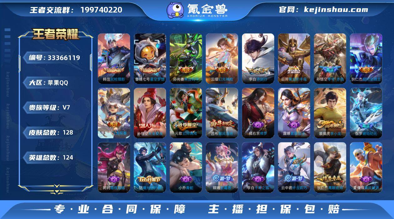TD264110可二次苹果Q-V7-永恒钻石V段位-123英雄-128皮肤-2典藏皮肤-7传说-34史诗 【荣耀典藏】:鲁班七号星空梦想,韩信弑枪猎影 【传说皮肤】:云缨幻光神枪,李白诗剑行,李元芳飞鸢探春,孙悟空零号赤焰,后羿黄金射手座,孙尚香末日机甲,狄仁杰超时空战士 【限定皮肤】:姜子牙天穹之誓,狄仁杰阴阳师,赵云皇家上将,吕布御风骁将,元歌云间偶戏,狄仁杰魔术师,狄仁杰万华元夜,项羽海滩派对,老夫子醍醐杖,程咬金演武夺筹,亚瑟潮玩骑士王,孙悟空大圣娶亲,孙悟空零号赤焰,李元芳云中旅人,雅典娜单词大作战,鬼谷子原初探秘者,沈梦溪大漠名商,明世隐疑决卦,裴擒虎李小龙,裴擒虎擒涛扼浪,云中君纤云弄巧,猪八戒西部大镖客,嫦娥拒霜思,蒙犽狂想玩偶喵,桑启海盐诗旅,张良古海寻踪,蒙犽百解令,高渐离燃音魔法,妲己灵卜魔法,鬼谷子天穹祈灯,伽罗琥珀纪元,沈梦溪龙舞盛年,刘邦剑破天穹,程咬金群星魔术团 【年限皮肤】:吕布御风骁将 【赛季限定】:明世隐疑决卦,老夫子醍醐杖,鬼谷子原初探秘者,狄仁杰万华元夜,程咬金演武夺筹,沈梦溪大漠名商,李元芳云中旅人,桑启海盐诗旅,裴擒虎擒涛扼浪,张良古海寻踪,鬼谷子天穹祈灯,刘邦剑破天穹,姜子...