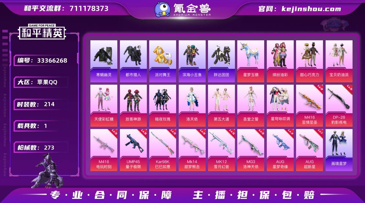 苹果 手Q-10粉装-11特效枪-1载具-3粉色飞行器-85193热力值-17王牌印记-214套装-273枪皮 【热门品类】:粉装-缤纷油彩,套装-寒蝎幽灵,套装-浪漫天命,套装-都市猎人,套装-派对舞王,套装-深海小丑鱼,套装-胖达团团,套装-暗夜之虎,套装-龟仙人,套装-暗影哥特,套装-粉红小猪,角色-8号机,角色-Mark.06,熔岩游骑兵连帽夹克 【粉色套装】:粉装-甜心巧克力,粉装-宝贝奶油派,粉装-天使彩虹糖,粉装-缤纷油彩,粉装-放客神游,粉装-暗夜玫瑰,角色-洛天依,粉装-第五大道,角色-圣堂之誓,粉装-星穹咏叹调 【粉色枪皮等级】:M416-至情至圣(九级),M416-电玩时刻(五级),AUG-超新星(一级),AUG-星梦奇缘(三级),ACE32-萌骑漫游(四级),UMP45-量子极限(五级),Kar98K-巳巳如意(五级),Mk14-甜梦熊击(五级),MK12-雪月幻音(五级),DP-28-豹影疾电(五级),MG3-洛神天依(五级) 【粉色载具】:星梦玉骢 【粉色枪皮】:M416-至情至圣,M416-电玩时刻,AUG-超新星,AUG-星梦奇缘,ACE32-萌骑漫游,UMP45-量子极限,Kar98K-巳巳如意,Mk14-甜梦熊击,MK12-雪月幻音,DP-28-豹影疾电,MG3-洛神天依 【粉色飞行器】:祥瑞起舞飞行器,沙丘之主天马,幻海仙踪飞行器 【粉色降落伞】...
