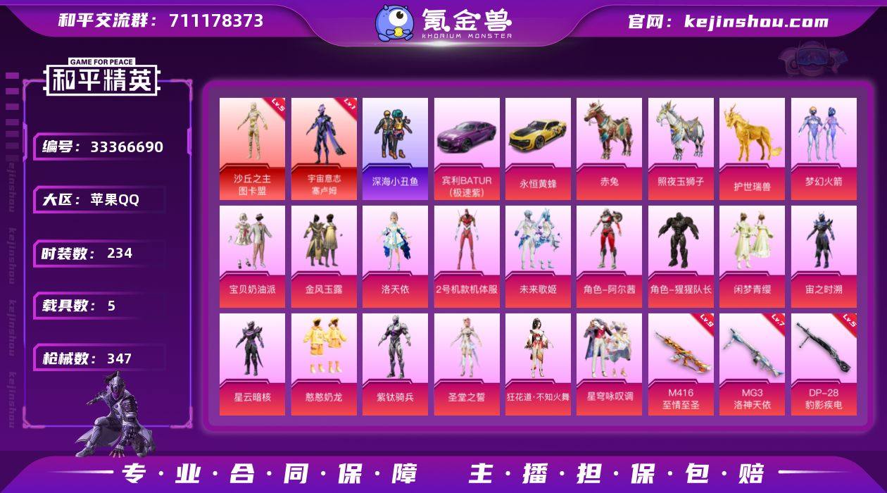 【kyhp1876】苹果 手Q-2神装-16粉装-14特效枪-5载具-10粉色飞行器-121685热力值-18王牌印记-234套装-347枪皮 【红色神装等级】:宇宙意志-塞卢姆(一级),沙丘之主-图卡盟(五级) 【红色角色神装】:宇宙意志-塞卢姆,沙丘之主-图卡盟 【热门品类】:粉装-梦幻火箭,绝对防御上衣,套装-深海小丑鱼,套装-小丑鱼,角色-军刀雅典娜,角色-2B战斗服款,角色-2P战斗服款,角色-忠猛周仓,角色-忠义严颜,套装-龟仙人,大砍刀-青龙偃月刀,撬棍-龙胆亮银枪 【粉色套装】:粉装-宝贝奶油派,粉装-梦幻火箭,粉装-金风玉露,角色-洛天依,角色-2号机款机体服,粉装-未来歌姬,角色-阿尔茜,角色-猩猩队长,粉装-闲梦青缨,角色-宙之时溯,角色-星云暗核,粉装-憨憨奶龙,角色-紫钛骑兵,角色-圣堂之誓,角色-狂花道·不知火舞,粉装-星穹咏叹调 【粉色枪皮等级】:AKM-绿萝繁花(五级),SCAR-L-万古烈焰(三级),M416-至情至圣(九级),UMP45-宇宙意志(三级),P90-沙丘之主(三级),P90-金丰海韵(五级),Kar98K-巳巳如意(五级),M24-镜域双华(二级),Mk14-盛世惊鸿(三级),Mk14-福马献瑞(五级),DP-28-豹影疾电(五级),MG3-洛神天依(七级),PKM-江南烟雨(一级) 【粉色载具】:宾利BATUR(极...
