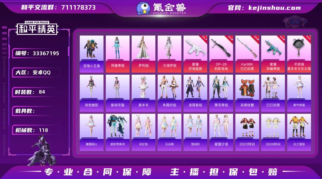 【kyhp1877】安卓 手Q-3粉装-6特效枪-0载具-1粉色飞行器-33628热力值-3王牌印记-84套装-118枪皮 【热门品类】:套装-深海小丑鱼 【粉色套装】:角色-萨利娅,角色-冷漠罗丽,角色-异瞳寒姬 【粉色枪皮等级】:蜜獾-荧海星豚(七级),蜜獾-异瞳寒姬(四级),UMP45-萌骑冒险(五级),Kar98K-巳巳如意(五级),DP-28-豹影疾电(五级),平底锅-喜羊羊与灰太狼(一级) 【粉色枪皮】:蜜獾-荧海星豚,蜜獾-异瞳寒姬,UMP45-萌骑冒险,Kar98K-巳巳如意,DP-28-豹影疾电,平底锅-喜羊羊与灰太狼 【粉色飞行器】:炫彩糖果飞行器 【粉色降落伞】:环太平洋降落伞,鬼刀降落伞,智耀战神降落伞,时光之吻降落伞,冷漠罗丽降落伞,喜羊羊与灰太狼降落伞,异瞳寒姬降落伞,炫彩糖果降落伞 【稀有套装】:套装-巳巳如意,套装-炫彩糖果,角色-都市丽猫,角色-糖霜甜心,套装-星影赞美诗,套装-彩虹兔,套装-云朵鹅,套装-雪绒豹,套装-蜜露汐语,套装-朱霞炽焰,套装-凌霄紫焰,套装-擎苍青焰,玩偶服-美羊羊,角色-绯色魅影,角色-紫俏灵猫 【稀有枪皮】:AKM-破晓战魂,AKM-龙的传人,M16A4-幻世战舞者,SCAR-L-炫彩节奏,SCAR-L-玉兔迎春,M416-红色方程式,M416-蓝色火焰,AUG-耀粉歌者,QBZ-...