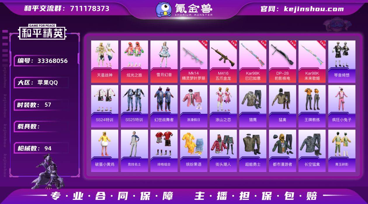 【kyhp1408】苹果 手Q-3粉装-6特效枪-0载具-1粉色飞行器-25885热力值-1王牌印记-57套装-94枪皮 【粉色套装】:粉装-天星战神,粉装-炫光之旅,粉装-雪月幻音 【粉色枪皮等级】:M416-五爪金龙(五级),Kar98K-未来歌姬(二级),Kar98K-巳巳如意(四级),Mk14-精灵梦叶罗丽(六级),Mk14-福马献瑞(四级),DP-28-豹影疾电(三级) 【粉色枪皮】:M416-五爪金龙,Kar98K-未来歌姬,Kar98K-巳巳如意,Mk14-精灵梦叶罗丽,Mk14-福马献瑞,DP-28-豹影疾电 【粉色飞行器】:炫彩糖果飞行器 【粉色降落伞】:星之彼岸降落伞,洛神天依降落伞,天星战神降落伞,未来歌姬降落伞,星梦奇缘降落伞,炫彩糖果降落伞 【稀有套装】:套装-雪国风尚,套装-炫彩糖果,角色-X,套装-马上来财,套装-琴音绮想,套装-雨过天青,套装-红釉青花 【稀有枪皮】:AKM-彩虹符号,AKM-星之彼岸,AKM-缤纷海域,AKM-龙的传人,SCAR-L-炫彩节奏,M416-蓝色火焰,GROZA-2B战斗服款,GROZA-懵萌河马,AUG-甜蜜菠萝,QBZ-未来歌姬,QBZ-洛神天依,M762-天星战神,Mk47-洛神天依,G36C-懵萌河马,AC-VAL-天降萌叽,ACE32-画境星梦,UZI-红色方程式,UMP45-生命誓言,Vector-彩虹符号,Vector-生命誓言,汤姆逊-天降萌...