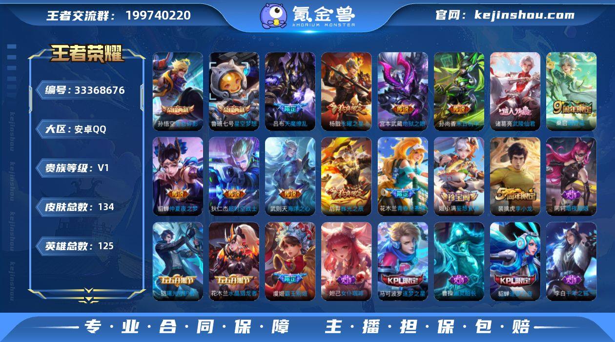 【编号08314 可秒换绑】【店长推荐!极品小号!猴子典藏 鲁班典藏 武陵仙君 天魔缭乱 后羿狗年限定 马克KPL限定 貂蝉KPL限定!!!!!】 安卓Q-V0-尊贵铂金IV段位-125英雄-134皮肤-2典藏皮肤-1典藏英雄-9传说-36史诗 【荣耀典藏】:武则天英雄,孙悟空全息碎影,鲁班七号星空梦想 【传说皮肤】:桑启鸣野蒿,杨戬永曜之星,诸葛亮武陵仙君,貂蝉仲夏夜之梦,孙尚香末日机甲,宫本武藏地狱之眼,吕布天魔缭乱,武则天海洋之心,狄仁杰超时空战士 【限定皮肤】:姜子牙天穹之誓,狄仁杰阴阳师,赵云皇家上将,庄周云端筑梦师,庄周高山流水,芈月重明,吕布天魔缭乱,夏侯惇朔风刀,曹操烛龙,典韦穷奇,马可波罗逐梦之星,狄仁杰魔术师,狄仁杰万华元夜,达摩沙漠行僧,项羽海滩派对,项羽霸王别姬,老夫子醍醐杖,貂蝉逐梦之音,程咬金演武夺筹,兰陵王金庭之子,花木兰青春决赛季,牛魔御旌,后羿辉光之辰,虞姬霸王别姬,杨玉环遇见飞天,杨戬永曜之星,太乙真人饕餮,鬼谷子原初探秘者,诸葛亮武陵仙君,苏烈千军破阵,弈星混沌棋,明世隐疑决卦,裴擒虎李小龙,狂铁御狮,米莱狄御霄,盾山御銮,上官婉儿梁祝,鬼谷子天穹祈灯,姬小满妄想食味 【年限皮肤】:杨戬永曜...