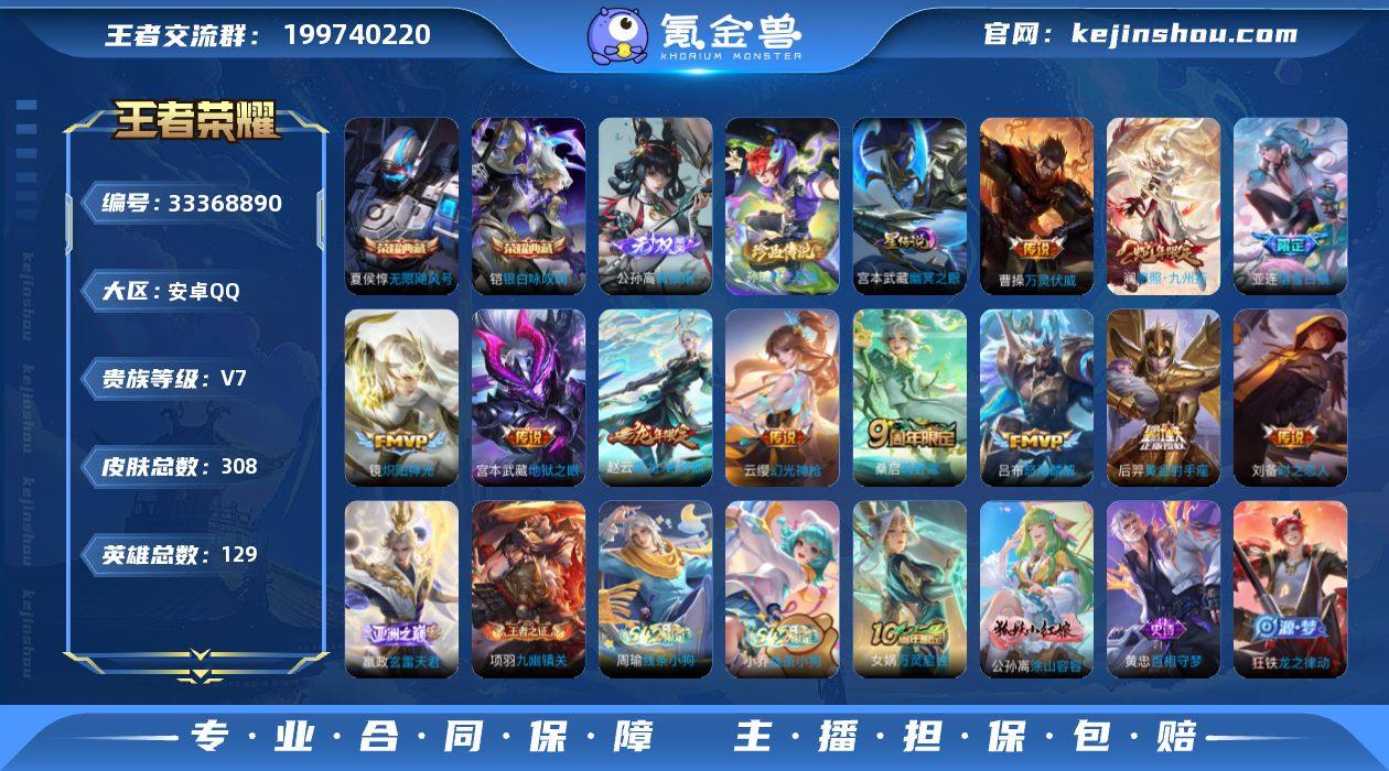 安卓Q-V7-至尊星耀III段位-129英雄-308皮肤-2典藏皮肤-2无双-2珍品传说-16传说-85史诗【英雄全皮】:孙权全皮,敖隐全皮,空空儿全皮,影全皮,海诺全皮【荣耀典藏】:夏侯惇无限飓风号,铠银白咏叹调【无双皮肤】:李信问心剑,公孙离离恨烟【珍品传说】:伽罗沧流箭,孙策时之奇旅【传说皮肤】:韩信踏浪归,云缨神骥越千峰,关羽神骥镇沧海,狄仁杰神骥赴朔漠,曹操万灵伏威,澜愿照九州拓,云缨幻光神枪,嬴政玄雷天君,桑启鸣野蒿,亚连落雪白狼,赵云乘龙铭钟鼎,吕布怒海麟威,镜炽阳神光,刘备时之恋人,后羿黄金射手座,宫本武藏地狱之眼【限定皮肤】:公孙离离恨烟,姜子牙天穹之誓,狄仁杰阴阳师,赵云皇家上将,嬴政优雅恋人,庄周高山流水,元歌无心,夏侯惇朔风刀,甄姬游园惊梦,曹操烛龙,典韦穷奇,典韦蓝屏警告,狄仁杰魔术师,狄仁杰万华元夜,达摩沙漠行僧,项羽海滩派对,老夫子醍醐杖,老夫子航海奇遇记,程咬金演武夺筹,兰陵王金庭之子,孙悟空至尊宝,牛魔御旌,后羿圣弓游侠,李元芳云中旅人,钟馗驱傩正仪,女娲朔望之晖,干将莫邪真爱魔法,雅典娜单词大作战,雅典娜黎明之约,蔡文姬繁星吟游,太乙真人饕餮,鬼谷子原初探秘者,鬼谷子五谷丰年,...