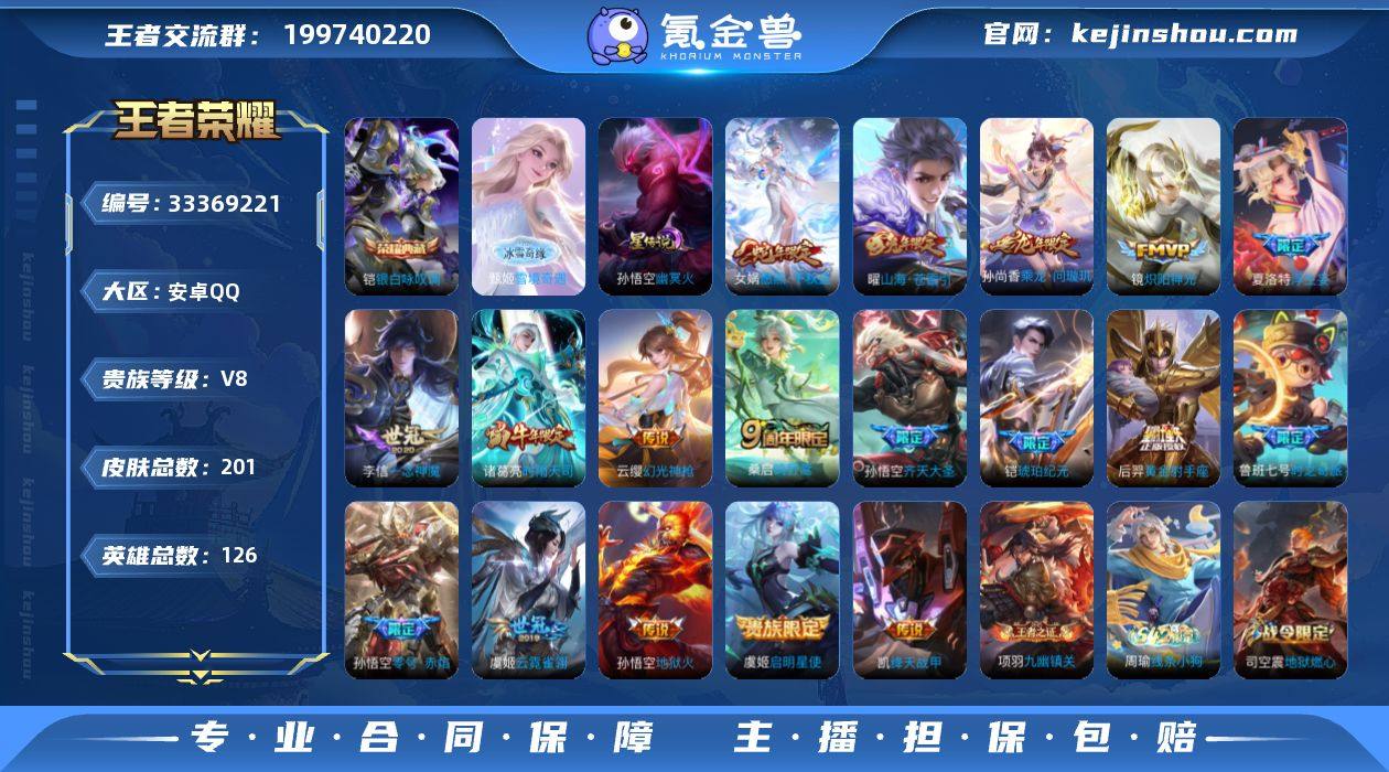 安卓Q-V8-永恒钻石V段位-126英雄-201皮肤-1典藏皮肤-1无双-18传说-48史诗【荣耀典藏】:铠银白咏叹调【无双皮肤】:甄姬雪境奇遇【传说皮肤】:女娲愿照千秋盛,云缨幻光神枪,桑启鸣野蒿,孙尚香乘龙问璇玑,铠琥珀纪元,鲁班七号时之奇旅,夏洛特浮生妄,孙悟空齐天大圣,曜山海苍雷引,诸葛亮时雨天司,铠绛天战甲,镜炽阳神光,虞姬启明星使,孙悟空零号赤焰,李信一念神魔,虞姬云霓雀翎,后羿黄金射手座,孙悟空地狱火 幽冥火【限定皮肤】:狄仁杰阴阳师,赵云皇家上将,赵云龙胆,墨子神迹守卫,鲁班七号时之奇旅,钟无艳超时空战士,元歌云间偶戏,元歌无心,甄姬落雪兰心,狄仁杰魔术师,狄仁杰万华元夜,达摩沙漠行僧,项羽海滩派对,老夫子醍醐杖,程咬金演武夺筹,兰陵王金庭之子,亚瑟潮玩骑士王,孙悟空大圣娶亲,孙悟空零号赤焰,孙悟空齐天大圣,李元芳云中旅人,虞姬启明星使,钟馗驱傩正仪,干将莫邪胡桃夹子,雅典娜单词大作战,鬼谷子原初探秘者,鬼谷子五谷丰年,诸葛亮时雨天司,苏烈千军破阵,梦奇顽趣,沈梦溪大漠名商,裴擒虎李小龙,裴擒虎擒涛扼浪,云中君纤云弄巧,嫦娥拒霜思,曜山海苍雷引,蒙犽狂想玩偶喵,鲁班大师探海日志,桑启海盐诗旅,...