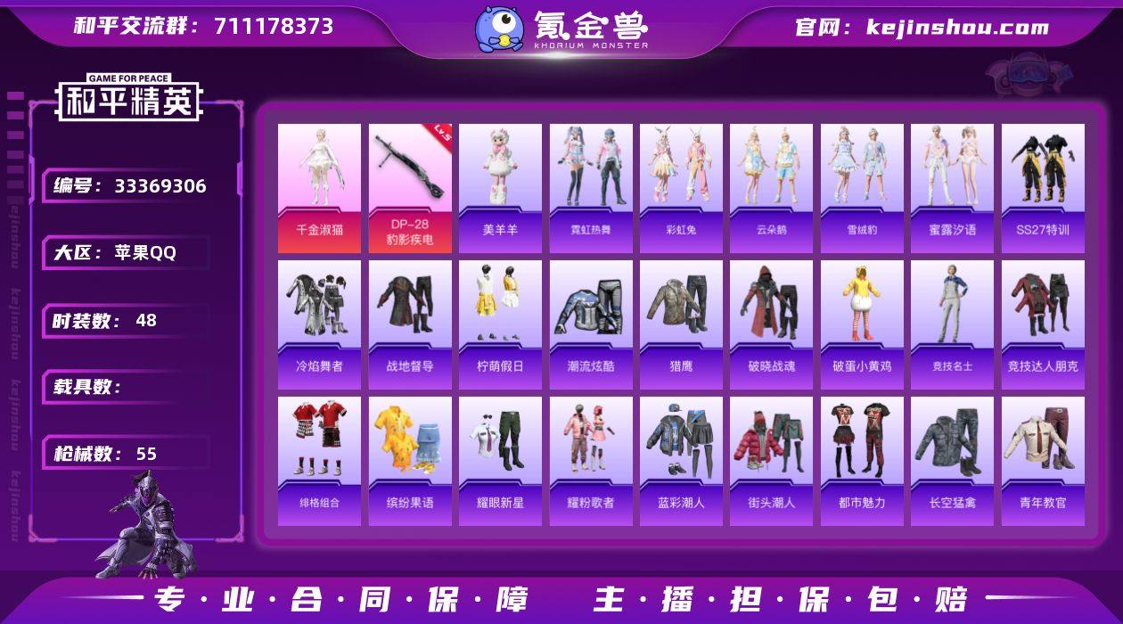 苹果 手Q-1粉装-1特效枪-0载具-1粉色飞行器-15139热力值-2王牌印记-48套装-55枪皮【粉色套装】:角色-千金淑猫【粉色枪皮等级】:DP-28-豹影疾电(五级)【粉色枪皮】:DP-28-豹影疾电【粉色飞行器】:炫彩糖果飞行器【粉色降落伞】:星穹咏叹调降落伞,幻彩电音降落伞,喜羊羊与灰太狼降落伞,炫彩糖果降落伞【稀有套装】:套装-炫彩糖果,套装-马上来财,套装-霓虹热舞,套装-彩虹兔,套装-云朵鹅,套装-雪绒豹,套装-蜜露汐语,玩偶服-美羊羊【稀有枪皮】:AKM-龙的传人,M16A4-幻世战舞者,M16A4-红色方程式,SCAR-L-炫彩节奏,SCAR-L-玉兔迎春,M416-红色方程式,AUG-耀粉歌者,M762-云朵鹅,G36C-星穹咏叹调,蜜獾-天降萌叽,UZI-啾咪啾咪,UMP45-炫光之旅,汤姆逊-天降萌叽,汤姆逊-甜梦小狐,Mini14-耀粉歌者,SVD-云朵鹅,DBS-荧海星豚,DBS-幻彩电音,SPAS-12-云朵鹅,M249-糯团青竹,DP-28-橘柚倾心,MG3-幻世战舞者,沙漠之鹰-云朵鹅,大砍刀-云朵鹅【其他套装】:套装-SS27特训,套装-冷焰舞者,套装-战地督导,套装-柠萌假日,套装-潮流炫酷,套装-猎鹰,套装-破晓战魂,套装-破蛋小黄鸡,套装-竞技名士,套装-竞技达人朋克,套装-绯格组合,套装-缤纷果语,套装-...