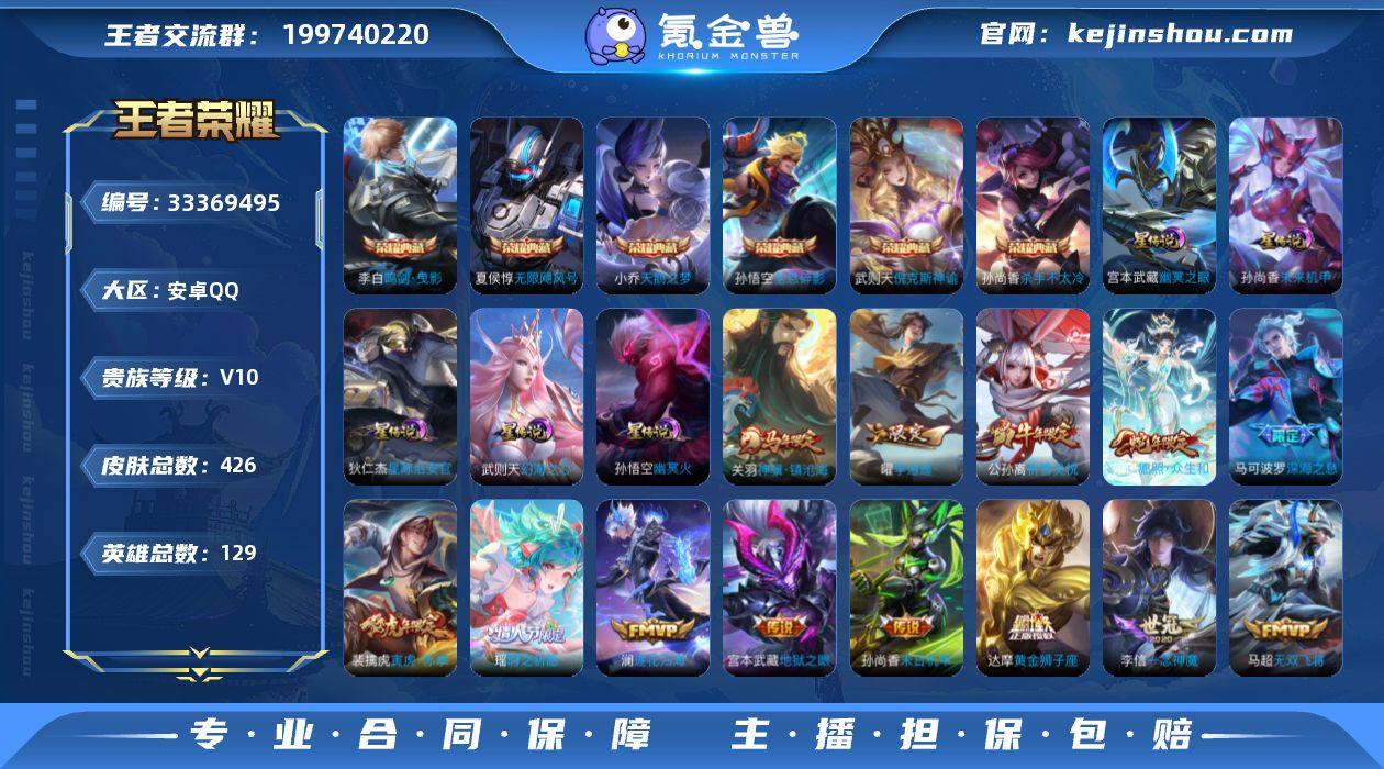V10-129英雄-426皮肤-6典藏皮肤-1典藏英雄-42传说-135史诗,cc8528 【英雄全皮】:刘邦全皮,钟馗全皮,鬼谷子全皮,狂铁全皮,敖隐全皮,金蝉全皮,赵怀真全皮,空空儿全皮 【荣耀典藏】:武则天英雄,孙悟空全息碎影,武则天倪克斯神谕,夏侯惇无限飓风号,小乔天鹅之梦,孙尚香杀手不太冷,李白鸣剑曳影 【传说皮肤】:关羽神骥镇沧海,妲己愿照众生和,云缨幻光神枪,桑启鸣野蒿,澜逐花归海,艾琳觅芳踪,不知火舞绯月行,王昭君星穹之声,马可波罗深海之息,马超无双飞将,大乔挚爱花嫁,孙策挚爱之约,露娜启示之音,孙策末日机甲,瑶时之祈愿,裴擒虎寅虎赤拳,鲁班七号寅虎瑞焰,孙尚香异界灵契,貂蝉遇见胡旋,赵云淬星耀世,曜李逍遥 ,兰陵王默契交锋,公孙离祈雪灵祝,诸葛亮时雨天司,铠绛天战甲,虞姬启明星使,曜云鹰飞将,李信一念神魔,貂蝉猫影幻舞,张良黄金白羊座,干将莫邪久胜战神,虞姬云霓雀翎,达摩黄金狮子座,花木兰冠军飞将,梦奇胖达荣荣,后羿黄金射手座,诸葛亮武陵仙君,孙尚香末日机甲,宫本武藏地狱之眼,孙悟空地狱火,武则天海洋之心,狄仁杰超时空战士 【限定皮肤】:白起狰,姜子牙天穹之誓,杨戬破阵退雄兵,狄仁杰阴阳师,虞姬凯尔...