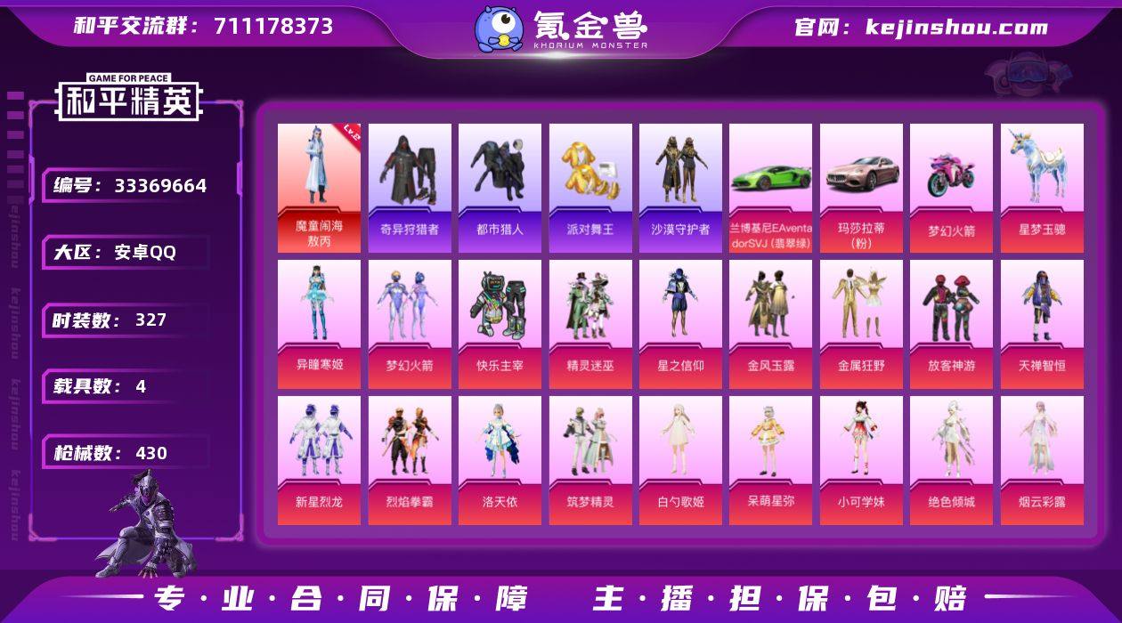 【无敌战神框 AUG-星梦奇缘1红装敖丙都市金鞋哥特沙漠黑丝小丑鱼ss1特训精品身法素材号】安卓 手Q-无敌战神框-1神装-21粉装-15特效枪-4载具-12粉色飞行器-159401热力值-22王牌印记-327套装-430枪皮 【红色神装等级】:魔童闹海-敖丙(二级) 【红色角色神装】:魔童闹海-敖丙 【热门品类】:粉装-梦幻火箭,套装-浪漫天命,套装-都市猎人,套装-派对舞王,套装-小丑鱼,套装-奇异狩猎者,套装-金羽特工,套装-沙漠守护者,套装-星河浪客,套装-SS1特训,旭日初心兜帽大衣,套装-龟仙人,套装-潮萌小黄鸭,套装-暗影哥特,套装-粉红小猪,熔岩游骑兵连帽夹克 【粉色套装】:粉装-快乐主宰,粉装-精灵迷巫,粉装-梦幻火箭,粉装-星之信仰,粉装-金风玉露,粉装-金属狂野,粉装-放客神游,粉装-天禅智恒,粉装-新星烈龙,粉装-烈焰拳霸,角色-洛天依,粉装-筑梦精灵,角色-白勺歌姬,角色-呆萌星弥,角色-小可学妹,角色-绝色倾城,角色-烟云彩露,角色-罗征,角色-绯穹魔姬,角色-异瞳寒姬,人物-小舞·灵珑 【粉色枪皮等级】:AKM-炫紫旋律(七级),SCAR-L-梦幻火箭(七级),M416-五爪金龙(七级),M416-风花雪月(七级),GROZA-无垠阁(三级),AUG-星梦奇缘(三级),M762-甜蜜誓约(七级...