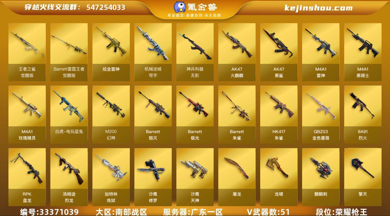 广东一区-57V-10王者武器数-1炫金武器数 【热门武器】:QBZ03-金色蔷薇,HK417-朱雀,M200-幻神,死亡之眼,白虎-电玩蓝兔,M4A1-黑骑士,汤姆逊-烈龙*6,RPK-盘龙*4,加特林-炼狱*2,羊驼玩偶,沙鹰-修罗*2,炽芒蝶刃 【王者炫金武器】:王者之魄高爆手雷,高爆手雷-雷霆王者*2,烟雾弹-雷霆王者*2,闪光弹-雷霆王者*2,炫金雷神 【音效卡】:M200-幻神音效卡,M4A1-雷神音效卡,M4A1-黑骑士音效卡,Barrett-毁灭音效卡,QBZ03-金色蔷薇音效卡 【皮肤】:雷神-暗月,雷神-虎将,雷神-宇航兔皮肤,火麒麟-平天大圣*2,毁灭耀金皮肤,毁灭-SV-CFPLS16冠军,毁灭-战神张飞,毁灭-黑大圣皮肤,毁灭-航天科技皮肤,毁灭-英雄计划 皮肤,黑骑士耀金皮肤,AK47-B-常胜将军-曹操,AK47-B-常胜将军-刘备,极光-能量核心,修罗-能量核心,修罗-星空,修罗-冠军之魂 【角色】:葵,太空指挥官,王者-瞳-闭月羞花,王者凌霄,雪域霜狐,乔伊教练,修道士,云海玲珑,暗夜-X,初恋灵狐,芳心审判者,嘉年华灵狐,娟娟,兰-新年限定,灵狐者-X,灵狐者-七夕宝贝,曼陀罗-礼服,潘多拉-X,潜龙队-X,兔囡囡,新娜塔莎,夜玫瑰-幻能朋克,樱-战斗天使,影武者-X,团团 【人偶武器】:AWM-灵狐...