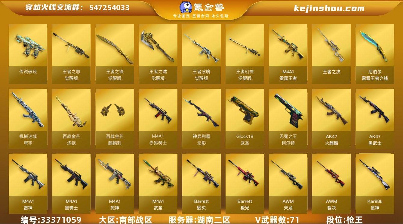 湖南二区-85V-27王者武器数-0炫金武器数 【传说武器】:传说破晓 【热门武器】:传说破晓,QBZ03-金色蔷薇,M14EBR-玄武,Scar Light-白虎,死亡之眼,Kar98K-星神,M4A1-黑骑士*2,汤姆逊-烈龙*7,加特林-炼狱,COP-白鲨,沙鹰-修罗 【王者炫金武器】:M4A1-雷霆王者,王者之决,雷霆王者之锋,王者之魄高爆手雷*3,王者之魄闪光弹*4,高爆手雷-雷霆王者*3,烟雾弹-雷霆王者*2,闪光弹-雷霆王者*2 【音效卡】:Kar98K-星神音效卡,屠龙-电竞之星-竞星跃动音效卡,AK47-火麒麟音效卡,M4A1-雷神音效卡,M4A1-黑骑士音效卡,Barrett-碧霄极光音效卡,炼狱-百战金芒-庆典舞曲音效卡 【皮肤】:幻神-CFS2022,星神-AG-CFPLS21冠军皮肤,裁决-运输船 皮肤,裁决-胜者为王 皮肤,ScarLight-白虎-冠军之虎皮肤,白虎-巅峰荣耀 皮肤,雷神-暗月,雷神-荣耀之魄,雷神-虎将,M4A1-再燃火线,雷神-神秘按键 皮肤,火麒麟-平天大圣,火麒麟-百城,火麒麟-心动糖果,毁灭-暗月,毁灭-CFS2020,毁灭-星耀 皮肤,毁灭-英雄计划 皮肤,黑龙-能量核心,黑骑士耀金皮肤,死神-秘银,AK47-黑武士-361,战神-粉色甜心皮肤,战神-紫绶金章皮肤,战神-流金岁月皮肤*2,AWM-天龙-传奇70KG,极光-能...