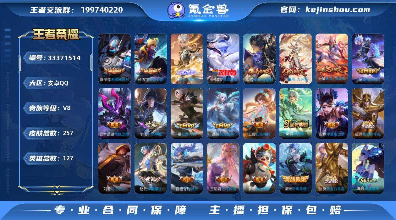 【WZSA1597】贵族等级8/荣耀典藏数量2/传说皮肤数量19/史诗皮肤数量71/皮肤数量257/英雄数量127/段位至尊星耀/孙权全皮/全息碎影/无限飓风号/器灵·螭龙剑/怪盗基德/马超神骥逐星野/愿照·九州拓/幻光神枪/鸣野蒿/乘龙·淬吴钩/澜逐花归海/碎云/淬星耀世/乞巧织情/游龙清影/启明星使/云鹰飞将/一念神魔/时之恋人-刘备/黄金白羊座/胖达荣荣/黄金射手座/仲夏夜之梦/地狱之眼/蒙犽顽岩魄/蔡文姬夏日便利店/虞姬夏日便利店/天穹之誓(s36)/破阵·退雄兵/阴阳师/皇家上将/无心/魔术师/万华元夜(s22)/沙漠行僧(s26)/海滩派对/醍醐杖(s20)/演武夺筹(s23)/傲雪梅枪/至尊宝/云中旅人(s29)/驱傩正仪(s24)/胡桃夹子/原初探秘者(s21)/千军破阵(s25)/原初追遂者/混沌棋(s18)/顽趣-梦奇/大漠名商(s28)/疑决卦(s19)/李小龙/擒涛扼浪(s31)/纤云弄巧/御銮(s16)/玲珑珍味/探海日志(s32)/海盐诗旅(s30)/流音漫舞/地狱燃心/江河有灵/古海寻踪(s33)/百解令(蒙犽)/蒙恬荣光圣徽/高渐离燃音魔法/妲己灵卜魔法/鬼谷子天穹祈灯(S34)/龙武盛年/剑破天穹(s35)/青焰无极/苍威无极/熔金海岸/噬灭天穹(s37)/谧流熔炉/虚灵犬护/逆浪荇歌/荣光之誓/星界战将/九幽镇关/破空之剑/撼地雄心/神迹守卫/百相守梦-百里守约/...