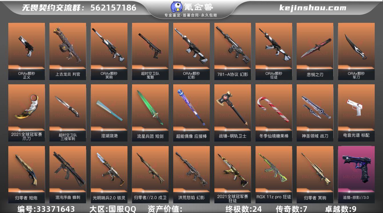 【956484】【套装】:2021全球冠军赛套装,无畏契约季前邀请赛套装,ORA x 颗秒套装,掠影//3.0套装 【英雄】:幻棱,炼狱,维斯,暮蝶,钛狐,壹决,铁臂,捷风,雷兹,幽影,不死鸟,贤者,猎枭,蝰蛇,零,芮娜,奇乐,尚勃勒,霓虹,斯凯,夜露,星礈,K/O,海神,盖可,黑梦,钢锁 【近战武器】:近战武器-2021全球冠军赛 爪刀,近战武器-碎心裂刃,近战武器-影蝶,近战武器-无畏契约季前邀请赛 悲悯之刃,近战武器-ORA x 颗秒 军刀,近战武器-超时空卫队 三棱军刺,近战武器-紫金爪刀,近战武器-澄湖潋滟,近战武器-流星兵团 短剑,近战武器-超能偶像 应援棒,近战武器-钢轨卫士 战锤,近战武器-夜刃诡镰,近战武器-冬季仙境 糖果棒,近战武器-神圣领域 战刀 【狂徒】:狂徒-2021全球冠军赛,狂徒-RGX 11z Pro,狂徒-ORA x 颗秒,狂徒-盖亚的复仇,狂徒-日冕雄师,狂徒-超能偶像,狂徒-钢轨卫士,狂徒-流星兵团 【幻影】:幻影-洪荒怒焰,幻影-ORA x 颗秒,幻影-781-A协议,幻影-神圣领域,幻影-聚合之力,幻影-战术小伙伴 【戍卫】:戍卫-归零者//2.0,戍卫-超能偶像,戍卫-钢轨卫士,戍卫-战术熊与伙伴们,戍卫-月球哨兵 【獠犬】:獠犬-神圣领域,獠犬-采蜜小蜂队,...