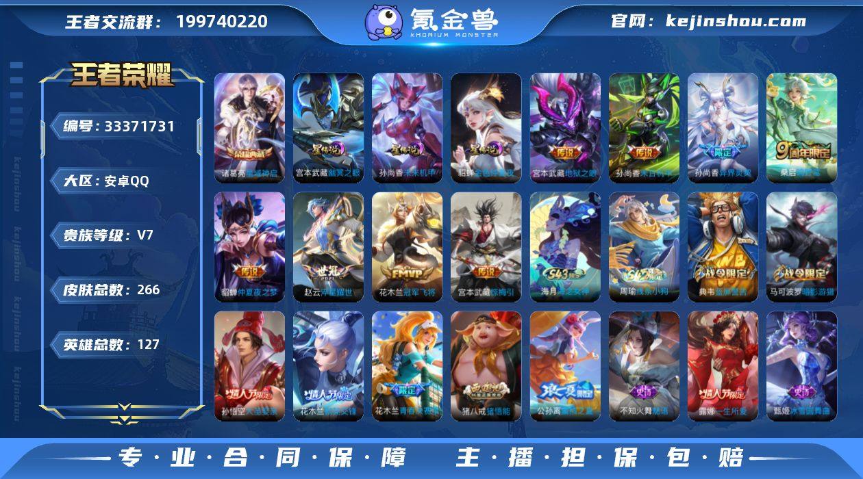 王者20662,金标杨戬7072,金标赵云8670,金标孙膑3819,金标老夫子3908,安卓Q-V7-至尊星耀V段位-127英雄-266皮肤-1典藏皮肤-8传说-75史诗 【英雄全皮】:猪八戒全皮,影全皮 【荣耀典藏】:诸葛亮星域神启 【传说皮肤】:桑启鸣野蒿,宫本武藏惊梅引,孙尚香异界灵契,赵云淬星耀世,花木兰冠军飞将,貂蝉仲夏夜之梦,孙尚香末日机甲,宫本武藏地狱之眼 【限定皮肤】:白起狰,姜子牙天穹之誓,杨戬破阵退雄兵,狄仁杰阴阳师,虞姬凯尔特女王,赵云皇家上将,嬴政优雅恋人,嬴政白昼王子,孙尚香蔷薇恋人,孙尚香异界灵契,鲁班七号狮舞东方,庄周蜃楼王,庄周高山流水,高渐离死亡摇滚,高渐离玩趣恶龙,阿轲迷踪丽影,孙膑妖精王,扁鹊炼金王,芈月重明,吕布猎兽之王,周瑜赤莲之焰,元歌无心,夏侯惇朔风刀,甄姬游园惊梦,曹操烛龙,典韦穷奇,典韦蓝屏警告,马可波罗暗影游猎,狄仁杰魔术师,狄仁杰万华元夜,达摩沙漠行僧,项羽海滩派对,老夫子醍醐杖,程咬金演武夺筹,露娜一生所爱,刘邦夺宝奇兵,兰陵王驯魔猎人,兰陵王金庭之子,花木兰青春决赛季,花木兰瑞麟志,花木兰默契交锋,孙悟空大圣娶亲,牛魔御旌,李元芳银河之约,李元芳云中旅人,钟馗神迹守卫,钟...
