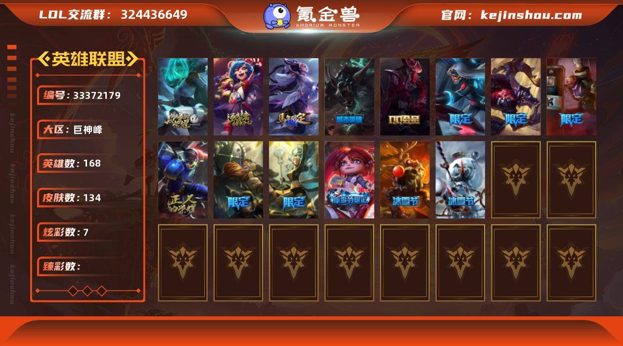 【LOLF3004】168英雄/134皮肤/2神话/14限定/7炫彩/6传说/28史诗/未定级/10周年 安妮/源代码 乐芙兰/广寒仙子 嫦娥/“主人不要我了” 阿木木/雪默丁格/圣诞玩偶 波比/圣诞驯鹿 克格莫/S1FNC 酒桶/S1FNC 迦娜/鬼影重重 魔腾/暗影 沃里克/创战纪 希维尔/都铎王朝 图奇/红桃杰克 崔斯特/防暴士兵 辛吉德/防暴天使 凯尔/女皇 艾希/绅士 科加斯/冰川巨兽 墨菲特/神拳 李青/第三类接触 黑默丁格/黯黑魔龙 希瓦娜/铁血剑豪 易/火箭达人 崔丝塔娜/黑色荆棘 莫甘娜/小小骑士 阿木木/贵族血统 萨科/武动巅峰 萨科/掠星魔刃 卡萨丁/穿着正装的恶魔 维迦/抵抗军天使 凯特琳/黑曜石守护者 墨菲特/V字仇杀者 布兰德/至高之拳 李青/屠龙勇士 薇恩/法老王朝 内瑟斯/四神之力 乌迪尔/星之守护者 波比/飞车暴走族 古拉加斯/大夏武士 潘森/银色之牙 阿卡丽/刺客信条 凯南/铁甲雄心 盖伦/至高君王 玛尔扎哈/侏罗纪化石 克格莫/ODST 地狱伞兵 拉克丝/钢之逆鳞 希瓦娜/永恒之森 赫卡里姆/五星大厨 塔姆/星际之门 阿兹尔/五杀摇滚鼓手奥拉夫/拆弹专家黑默丁格/创意工坊黑默丁格/亮丽女神希维尔/烈焰猛士奥拉夫/深潜蛙人古拉加斯/黑暗骑士奥拉夫/幽蓝梦魇加里奥/皇家守卫赵信/幽魂费德提克/星战易/金牛座...