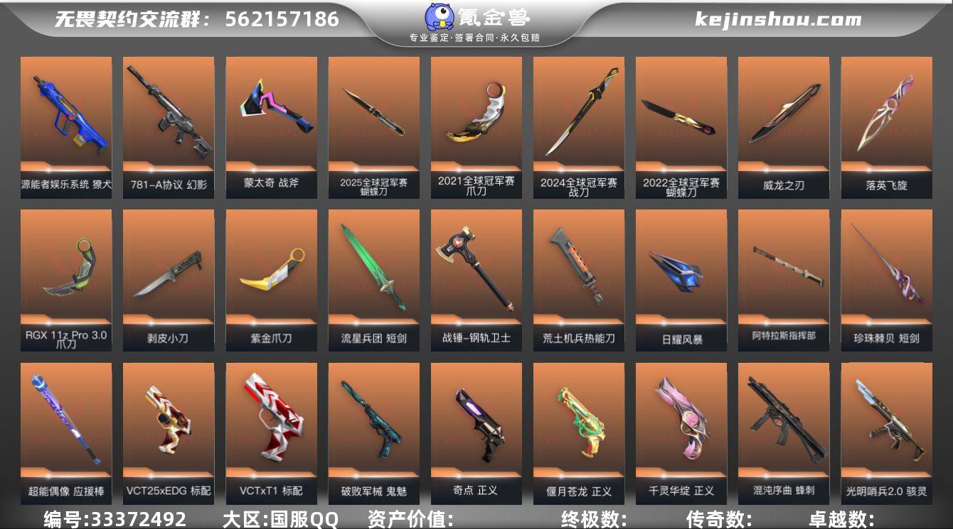 段位: 神话 亮点皮肤: 狂徒-2021全球冠军赛,爪刀-2021全球冠军赛,幻影-2024全球冠军赛,战刀-2024全球冠军赛,幻影-2022全球冠军赛,蝴蝶刀-2022全球冠军赛,悲悯之刃 套装: 2021全球冠军赛套装,2024全球冠军赛套装,耀鳞威龙套装,千灵华绽套装,2022全球冠军赛,2025全球冠军赛,VCT LOCK//IN 近战武器皮肤: 剥皮小刀-异形猎人,紫金爪刀-紫阙金琅//2.0,威龙之刃-耀鳞威龙,短剑-珍珠棘贝,落英飞旋-千灵华绽,超能偶像 应援棒,爪刀-RGX 11z Pro 3.0,短剑-流星兵团,战锤-钢轨卫士,荒土机兵热能刀,日耀风暴,阿特拉斯指挥部,2025全球冠军赛 蝴蝶刀,蒙太奇 战斧 步枪皮肤: 狂徒-盖亚的复仇,幻影-侦察力量,狂徒-冰点凝冻,戍卫-天界神兵,幻影-781-A协议,狂徒-耀鳞威龙,狂徒-堕天遗武,幻影-千灵华绽,獠犬-源能者娱乐系统,狂徒-混沌序曲,狂徒-双城之战,幻影-异鳞魔蛇,幻影-末日泡泡,2025全球冠军赛 狂徒,超集系统 狂徒,蒙太奇 幻影,风暴之子 戍卫 佩枪皮肤: 正义-奇点,正义-偃月苍龙,鬼魅-天界神兵,鬼魅-破败军械,鬼魅-耀鳞威龙,标配-VCTxT1,短炮-般若假面,正义-千灵华绽,标配-VCT25xEDG,狂怒-离子武器2.0,超集系统 标配,风暴之子 正义,蒙太奇 狂怒 狙击枪皮肤: 飞将-塑水宗,冥驹-堕天遗武,冥驹-...