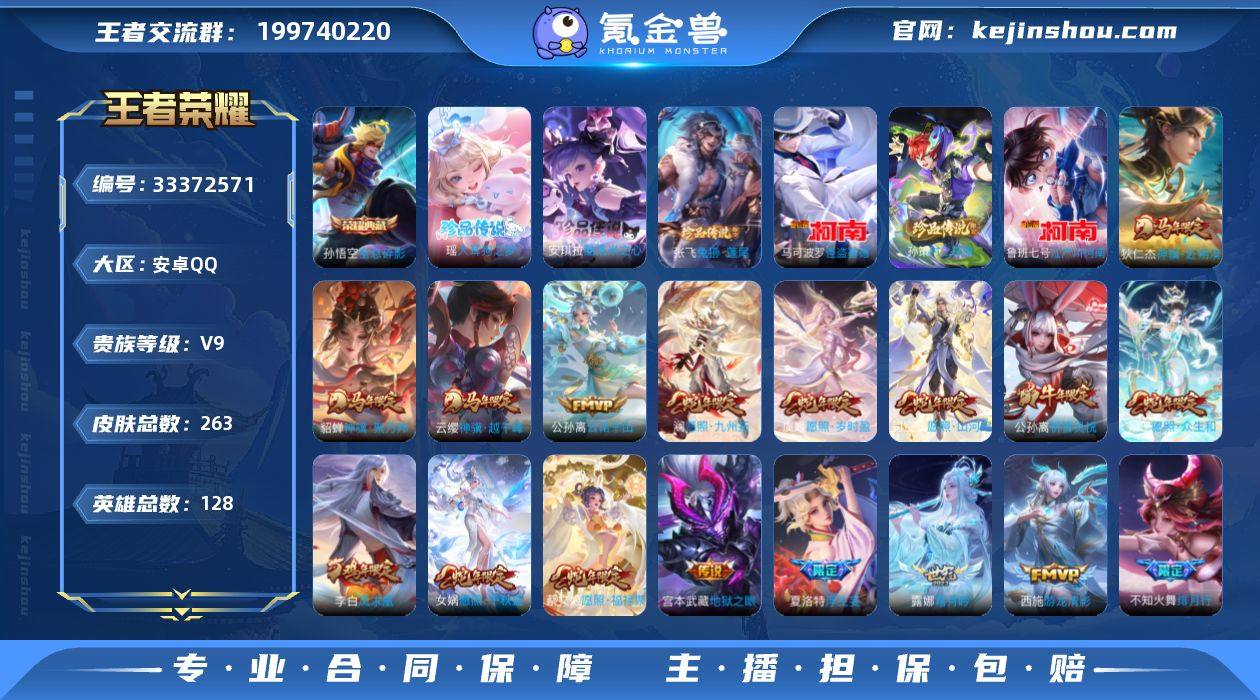 安卓Q-V9-永恒钻石I段位-128英雄-263皮肤-1典藏皮肤-6珍品传说-30传说-60史诗 【英雄全皮】:影全皮 【荣耀典藏】:孙悟空全息碎影 【珍品传说】:安琪拉酷洛米之心,瑶大耳狗之梦,张飞兔狲蓬尾,孙策时之奇旅,鲁班七号江户川柯南,马可波罗怪盗基德 【传说皮肤】:云缨神骥越千峰,狄仁杰神骥赴朔漠,貂蝉神骥聚万邦,公孙离云诺千山,司空震愿照山河定,女娲愿照千秋盛,妲己愿照众生和,澜愿照九州拓,蔡文姬愿照福禄聚,虞姬愿照岁时盈,王昭君映山客,桑启鸣野蒿,露娜霜月吟,兰陵王影龙天霄,夏洛特浮生妄,小乔山海琳琅生,不知火舞绯月行,孙尚香音你闪耀,露娜启示之音,王昭君乞巧织情,西施游龙清影,公孙离祈雪灵祝,虞姬启明星使,孙悟空零号赤焰,干将莫邪久胜战神,后羿黄金射手座,貂蝉仲夏夜之梦,李白凤求凰,宫本武藏地狱之眼,孙悟空地狱火 【限定皮肤】:姜子牙天穹之誓,狄仁杰阴阳师,小乔山海琳琅生,赵云皇家上将,赵云百木心枪,周瑜赤莲之焰,夏侯惇朔风刀,马可波罗暗影游猎,马可波罗山海玄木吟,狄仁杰魔术师,达摩沙漠行僧,项羽海滩派对,老夫子醍醐杖,关羽冰锋战神,安琪拉魔法小厨娘,程咬金演武夺筹,露娜一生所爱,露娜启示之音,韩...