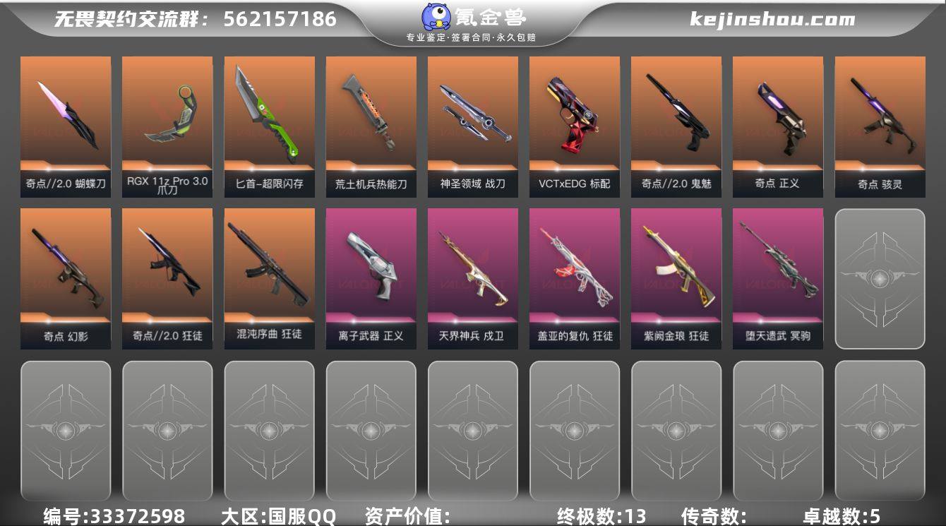 【套装】:奇点//2.0套装,VCTxEDG 队伍套装,回火礼包:奇点套装 【英雄】:幻棱,炼狱,维斯,暮蝶,钛狐,壹决,铁臂,捷风,雷兹,幽影,不死鸟,贤者,猎枭,蝰蛇,零,芮娜,奇乐,尚勃勒,霓虹,斯凯,夜露,星礈,K/O,海神,盖可,黑梦,钢锁 【近战武器】:近战武器-奇点//2.0 蝴蝶刀,近战武器-RGX 11z Pro//3.0 爪刀,近战武器-鬼丸国纲,近战武器-超限闪存 匕首,近战武器-荒土机兵 热能刀,近战武器-神圣领域 战刀 【狂徒】:狂徒-混沌序曲,狂徒-奇点//2.0,狂徒-盖亚的复仇,狂徒-紫阙金琅,狂徒-荒土机兵 【幻影】:幻影-奇点,幻影-超限闪存,幻影-神圣领域,幻影-纳米打击 【戍卫】:戍卫-天界神兵,戍卫-浮光跃金,戍卫-逆冲蛮牛,戍卫-月球哨兵 【獠犬】:獠犬-神圣领域,獠犬-模拟赫兹,獠犬-逆冲蛮牛 【冥驹】:冥驹-堕天遗武,冥驹-荒土机兵,冥驹-模拟赫兹,冥驹-星云暗涌 【莽侠】:莽侠-超限闪存,莽侠-月球哨兵 【战神】:战神-神圣领域,战神-浮光跃金 【奥丁】:奥丁-纳米打击 【判官】:判官-纳米打击x 【雄鹿】:雄鹿-模拟赫兹,雄鹿-逆冲蛮牛,雄鹿-月球哨兵 【骇灵】:骇灵-奇点,骇灵-荒土机兵,骇灵-浮光跃金,骇灵-星云暗涌 【蜂刺】:...