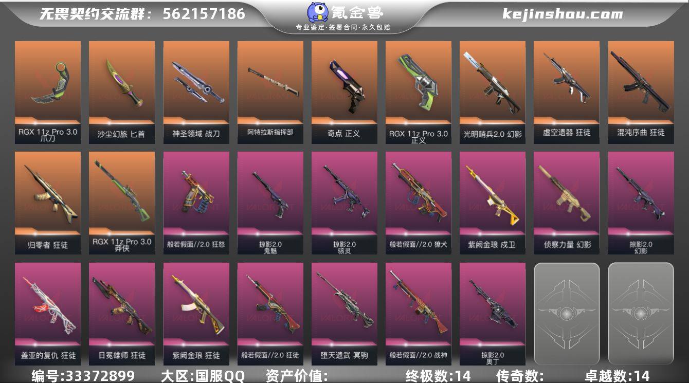 【套装】:RGX 11z Pro//3.0套装,掠影//2.0套装,般若假面//2.0套装 【英雄】:幻棱,炼狱,维斯,暮蝶,钛狐,壹决,铁臂,捷风,雷兹,幽影,不死鸟,贤者,猎枭,蝰蛇,零,芮娜,奇乐,尚勃勒,霓虹,斯凯,夜露,星礈,K/O,海神,盖可,黑梦,钢锁 【近战武器】:近战武器-影钩,近战武器-剥皮小刀,近战武器-RGX 11z Pro//3.0 爪刀,近战武器-鬼丸国纲,近战武器-沙尘幻旅 匕首,近战武器-神圣领域 战刀,近战武器-阿特拉斯指挥部 甩棍 【狂徒】:狂徒-归零者,狂徒-混沌序曲,狂徒-虚空遗器,狂徒-般若假面//2.0,狂徒-盖亚的复仇,狂徒-日冕雄师,狂徒-紫阙金琅,狂徒-沙尘幻旅 【幻影】:幻影-光明哨兵//2.0,幻影-侦察力量,幻影-掠影//2.0,幻影-神圣领域 【戍卫】:戍卫-紫阙金琅,戍卫-萌彩剪影,戍卫-月球哨兵 【獠犬】:獠犬-般若假面//2.0,獠犬-神圣领域,獠犬-胡桃狂想 【冥驹】:冥驹-堕天遗武,冥驹-胡桃狂想,冥驹-星云暗涌 【飞将】:飞将-沙尘幻旅 【莽侠】:莽侠-RGX 11z Pro//3.0,莽侠-月球哨兵 【战神】:战神-般若假面//2.0,战神-神圣领域,战神-萌彩剪影 【奥丁】:奥丁-掠影//2.0 【判官】:判官-萌彩剪影 【雄鹿】:雄鹿-月球哨兵 【骇灵】...
