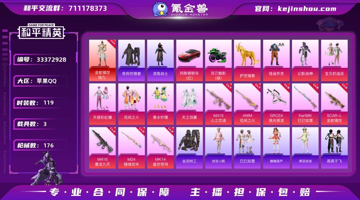 苹果 手Q-1神装-7粉装-8特效枪-3载具-8粉色飞行器-64270热力值-8王牌印记-119套装-176枪皮 【红色神装等级】:金蛇镇世-烛九(一级) 【红色角色神装】:金蛇镇世-烛九 【热门品类】:粉装-怪诞乔克,套装-奇异狩猎者,套装-金羽特工,套装-浪客战士 【粉色套装】:粉装-幻影战神,粉装-怪诞乔克,粉装-宝贝奶油派,粉装-天使彩虹糖,粉装-花间之火,粉装-香水柠檬,粉装-天之羽翼 【粉色枪皮等级】:SCAR-L-金蛇镇世(三级),M416-心之恋语(七级),M416-墨龙九天(三级),GROZA-镜光银凌(五级),Kar98K-巳巳如意(五级),M24-镜域双华(三级),AWM-花间之火(七级),Mk14-盛世惊鸿(三级) 【粉色载具】:阿斯顿马丁DBS(红),双人摩托-双刃魅影(绿),护世瑞兽 【粉色枪皮】:SCAR-L-金蛇镇世,M416-心之恋语,M416-墨龙九天,GROZA-镜光银凌,Kar98K-巳巳如意,M24-镜域双华,AWM-花间之火,Mk14-盛世惊鸿 【粉色飞行器】:花间之火飞行器,终极赛罗飞行器,绚金瑰梦飞行器,天之羽翼飞行器,沙丘之主天马,镜域双华-灵镜之阶,凤舞九天飞行器,万象金身飞行器 【粉色降落伞】:百万伏特降落伞,未来战士降落伞,甜心宝贝降落伞,马卡龙降落伞,花间之火降落伞,锦绣火鲤降落伞,...