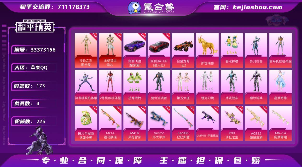 173套装/枪械9/装备285/载具4/战备171/王牌印记10/热力值98301/五级M416-风花雪月/二级ACE32-萌骑漫游/三级UMP45-宇宙意志/五级Vector-环太平洋/三级P90-沙丘之主/五级Kar98K-巳巳如意/五级MK14-福马献瑞/七级破片手榴弹-贪吃小熊/一级金蛇镇世-烛九/六级沙丘之主-图卡盟/一级宾利BATUR(星火红)/二级宾利飞驰(皇家紫)/金蛇镇世-烛九/沙丘之主-图卡盟/军刀雅典娜/龟仙人/8号机/香水柠檬/吟月归客/零号机款机体服/初号机款机体服/2号机款机体服/恐龙拽拽/复仇流浪者/第五大道/镜光幻境/冰炎战车/紫钛骑兵/星梦奇缘/宾利BATUR(星火红)/宾利飞驰(皇家紫)/合金龙骨(红)/护世瑞兽/M416风花雪月/ACE32-萌骑漫游/UMP45-宇宙意志/Vector环太平洋/P90沙丘之主/Kar98K-巳巳如意/MK14闲梦青缨/MK14-福马献瑞/破片手榴弹-贪吃小熊/酣梦熊熊飞行器/飞行器-风花雪月/沙丘之主天马飞行器/万象金身飞行器/神秘黑猫降落伞/四圣焕新降落伞/香水柠檬降落伞/梦之光华降落伞/洛神天依降落伞/风花雪月降落伞/恐龙拽拽降落伞/环太平洋降落伞/仲夏莫吉托降落伞/闲梦青缨降落伞/炫光之旅降落伞/熔岩统帅降落伞/沙丘之主降落伞/辉耀战甲降落伞/金蛇镇世降落伞/巳巳如意/马上有钱/迅捷龙虾/雏菊兔兔/萝兰...