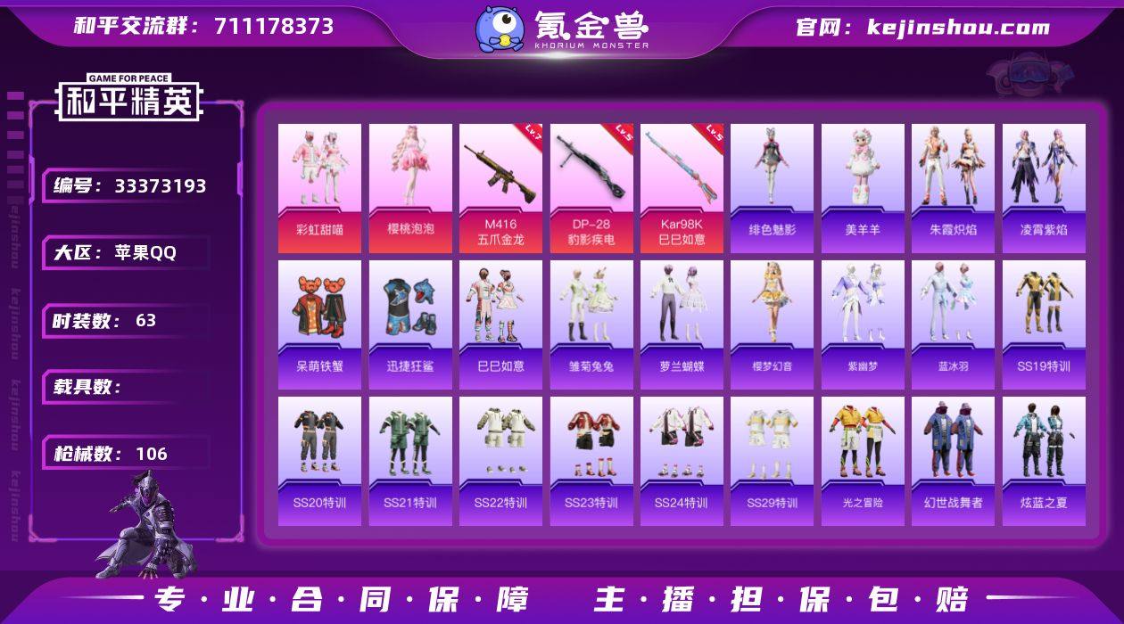 苹果【小号 M416-五爪金龙(七级),Kar98K-巳巳如意(五级)】 手Q-3粉装-3特效枪-0载具-2粉色飞行器-30107热力值-5王牌印记-63套装-106枪皮 【粉色套装】:粉装-彩虹甜喵,角色-樱桃泡泡,角色-罪夜之冕 【粉色枪皮等级】:M416-五爪金龙(七级),Kar98K-巳巳如意(五级),DP-28-豹影疾电(五级) 【粉色枪皮】:M416-五爪金龙,Kar98K-巳巳如意,DP-28-豹影疾电 【粉色飞行器】:炫彩糖果飞行器,歌者泠鸢飞行器 【粉色降落伞】:旋转彩虹降落伞,喜羊羊与灰太狼降落伞,魔童闹海 哪吒降落伞,异瞳寒姬降落伞,炫彩糖果降落伞 【稀有套装】:套装-巳巳如意,套装-雪国风尚,套装-炫彩糖果,套装-雏菊兔兔,套装-萝兰蝴蝶,套装-樱梦幻音,套装-紫幽梦,套装-蓝冰羽,套装-朱霞炽焰,套装-凌霄紫焰,玩偶服-美羊羊,角色-绯色魅影 【稀有枪皮】:AUG-冰晶雪宝,AKM-生命誓言,AKM-破晓战魂,AKM-缤纷海域,AKM-龙的传人,M416-糯团青竹,M416-蓝色火焰,GROZA-田园牧歌,AUG-天降萌叽,Mk47-洛神天依,G36C-星穹咏叹调,AC-VAL-天降萌叽,蜜獾-天降萌叽,蜜獾-娇憨猪猪,ARX-凌霄紫焰,UZI-娇憨猪猪,UMP45-生命誓言,Vector-田园牧歌,汤姆逊-智耀战神,JS9-凌霄紫焰,M24-影袭,VS...