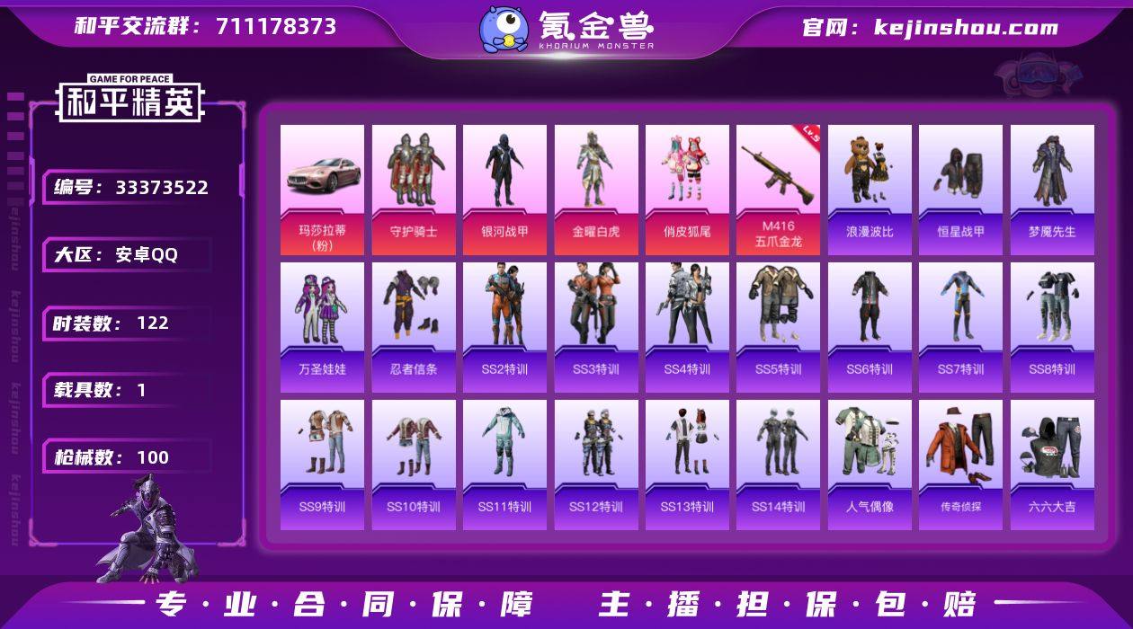安卓 手Q-4粉装-1特效枪-1载具-0粉色飞行器-38122热力值-1王牌印记-122套装-100枪皮 【热门品类】:套装-忍者信条,套装-SS1特训,旭日初心兜帽大衣,套装-浪漫波比 【粉色套装】:粉装-守护骑士,粉装-银河战甲,粉装-金曜白虎,粉装-俏皮狐尾 【粉色枪皮等级】:M416-五爪金龙(五级) 【粉色载具】:玛莎拉蒂Ghibli(粉) 【粉色枪皮】:M416-五爪金龙 【粉色降落伞】:快乐主宰降落伞,幻影战神降落伞,银河战甲降落伞,雪国幻梦降落伞,香水柠檬降落伞 【稀有枪皮】:AKM-夜灯,AKM-破晓战魂,AKM-霓虹街区,M16A4-星际漫游,M16A4-生命誓言,M16A4-红色方程式,M16A4-蓝色火焰,SCAR-L-炫彩节奏,SCAR-L-银河战甲,M416-夜灯,M416-红色方程式,M416-蓝色火焰,GROZA-影袭,GROZA-治愈之星,GROZA-生命誓言,GROZA-银河战甲,AUG-幻影战神,AUG-拳皇97,QBZ-原初圣火,QBZ-诡娃娃,QBZ-银河战甲,M762-拳皇97,M762-牛气冲天,M762-生命誓言,M762-诡娃娃,M762-镭射皇者,Mk47-粉色回忆,G36C-雪国精灵,UZI-红色方程式,UMP45-夜灯,UMP45-生命誓言,UMP45-荒野猎神,UMP45-蓝色火焰,UMP45-诡娃娃,Vector-PEL轰鸣竞梦者,Vector-彩虹符号,Vector-治愈之星,Vector-银...