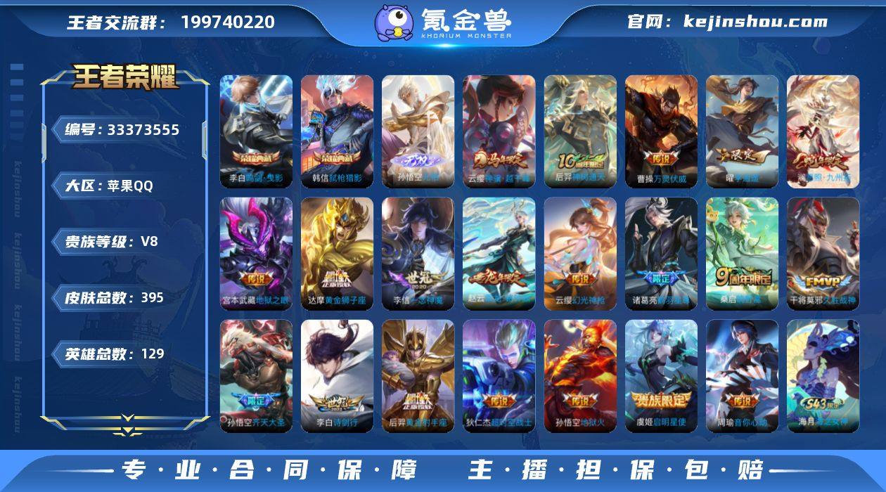 苹果Q-V8-最强王者段位-129英雄-395皮肤-2典藏皮肤-1无双-20传说-123史诗 【英雄全皮】:刘邦全皮,孙权全皮,敖隐全皮,莱西奥全皮,空空儿全皮,影全皮 【荣耀典藏】:李白鸣剑曳影,韩信弑枪猎影 【无双皮肤】:孙悟空无相 【传说皮肤】:云缨神骥越千峰,后羿神树通天,曹操万灵伏威,澜愿照九州拓,云缨幻光神枪,桑启鸣野蒿,赵云乘龙铭钟鼎,诸葛亮鹤羽星尊,孙悟空齐天大圣,李白诗剑行,曜李逍遥 ,周瑜音你心动,虞姬启明星使,李信一念神魔,干将莫邪久胜战神,达摩黄金狮子座,后羿黄金射手座,宫本武藏地狱之眼,孙悟空地狱火,狄仁杰超时空战士 【限定皮肤】:蔡文姬夏日便利店,虞姬夏日便利店,姜子牙天穹之誓,李白谪仙醉月,狄仁杰阴阳师,赵云皇家上将,墨子神迹守卫,孙尚香蔷薇恋人,庄周高山流水,阿轲迷踪丽影,扁鹊奇幻香踪,芈月重明,芈月幻夜卜梦,周瑜赤莲之焰,元歌云间偶戏,夏侯惇朔风刀,曹操烛龙,曹操天狼征服者,典韦穷奇,狄仁杰魔术师,狄仁杰万华元夜,达摩星际陆战队,达摩沙漠行僧,项羽海滩派对,老夫子醍醐杖,老夫子航海奇遇记,关羽冰锋战神,貂蝉逐梦之音,程咬金演武夺筹,刘邦夺宝奇兵,韩信逐梦之影,韩信傲雪梅枪,兰陵王金...