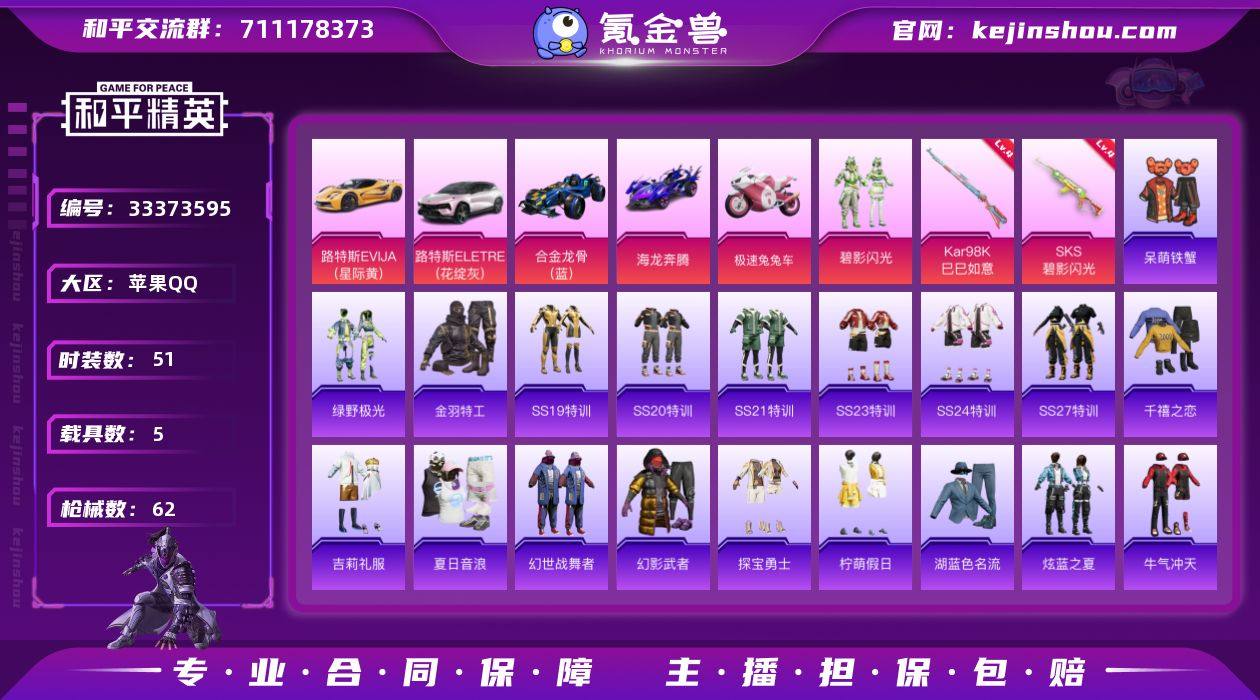 苹果 【小号 合金龙骨(蓝),海龙奔腾,1粉装-2特效枪-5载具-1粉色飞行器】手Q--25282热力值-4王牌印记-51套装-62枪皮 【热门品类】:套装-金羽特工 【粉色套装】:粉装-碧影闪光 【粉色枪皮等级】:Kar98K-巳巳如意(四级),SKS-碧影闪光(四级) 【粉色载具】:路特斯EVIJA(星际黄),路特斯ELETRE(花绽灰),合金龙骨(蓝),海龙奔腾,极速兔兔车 【粉色枪皮】:Kar98K-巳巳如意,SKS-碧影闪光 【粉色飞行器】:绿意幻情飞行器 【粉色降落伞】:焦糖拿铁降落伞,碧影闪光降落伞 【稀有枪皮】:AKM-恐龙拽拽,AKM-破晓战魂,AKM-龙的传人,M16A4-幻世战舞者,SCAR-L-炫彩节奏,SCAR-L-玉兔迎春,SCAR-L-碧影闪光,M416-暗夜行者,M416-糯团青竹,M416-红色方程式,M416-绿野极光,GROZA-恐龙拽拽,AUG-天降萌叽,AUG-耀粉歌者,AUG-青春冒险家,QBZ-彩虹符号,QBZ-飞驰魅影,M762-天降萌叽,M762-奇异狩猎者,蜜獾-垂柳戏鸭,蜜獾-娇憨猪猪,UZI-天降萌叽,UZI-娇憨猪猪,UZI-红色方程式,UMP45-夜灯,UMP45-生命誓言,Vector-音爆索尼克,汤姆逊-天降萌叽,汤姆逊-耀粉歌者,P90-飞驰魅影,Kar98K-炫彩节奏,Kar98K-飞驰魅影,M24-炫彩节奏,SKS-焦糖拿铁,VSS-碧影闪光,...