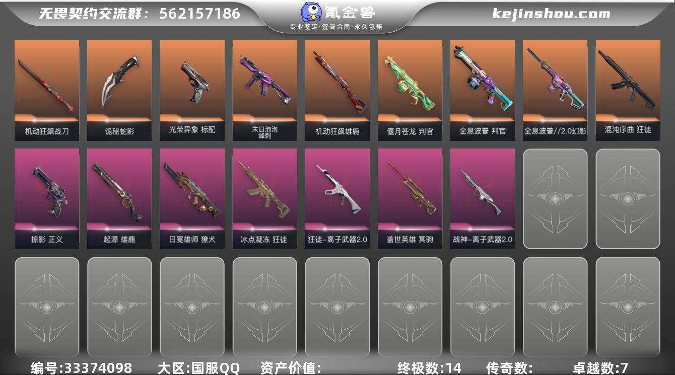 【英雄】:幻棱,炼狱,暮蝶,壹决,铁臂,捷风,幽影,不死鸟,贤者,猎枭,零,芮娜,尚勃勒,霓虹,斯凯,夜露 【近战武器】:近战武器-盖亚之愠,近战武器-机动狂飙 战刀,近战武器-天玄刀,近战武器-诡秘蛇影 军刀 【狂徒】:狂徒-混沌序曲,狂徒-冰点凝冻,狂徒-离子武器//2.0,狂徒-诡秘蛇影 【幻影】:幻影-全息波普//2.0,幻影-末日之翼 【戍卫】:戍卫-荆刺圣骸,戍卫-折光棱晶 【獠犬】:獠犬-日冕雄师 【冥驹】:冥驹-盖世英雄 【飞将】:飞将-末日之翼 【莽侠】:莽侠-诡秘蛇影 【战神】:战神-离子武器//2.0 【奥丁】:奥丁-末日之翼 【判官】:判官-全息波普,判官-偃月苍龙,判官-诡秘蛇影 【雄鹿】:雄鹿-机动狂飙,雄鹿-起源 【蜂刺】:蜂刺-末日泡泡,蜂刺-折光棱晶 【标配】:标配-光荣异象,标配-折光棱晶 【正义】:正义-掠影 【鬼魅】:鬼魅-诡秘蛇影 【短炮】:短炮-末日之翼 【卡面】:欢迎来到底城 卡面,正义的化身 卡面,Clutch 卡面,西装暴徒 卡面,无畏契约GO!第一卷:芮娜 卡面,无畏契约GO!第一卷:零 卡面,同步耍酷 卡面,完美调谐 卡面 ,暗枪 卡面,代号红色 卡面,新兵报到 卡面,V契约 卡面,无畏契约 卡面 【喷漆】:买装还是存钱...