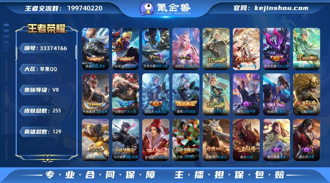 V8 3典藏 8传说 2星元 255皮肤 129英雄 【3水晶】李白-鸣剑·曳影,孙悟空-全息碎影【8传说】孙悟空-齐天大圣,干将莫邪-久胜战神,宫本武藏-地狱之眼,武则天-海洋之心,虞姬-启明星使,桑启-鸣野蒿,澜-愿照·九州拓,后羿-神树通天【2星元】武则天-幻海之心,宫本武藏-幽冥之眼【75史诗】鬼谷子-五谷丰年,赵云-未来纪元,澜-赏金猎手,阿轲-暗夜猫娘,阿轲-节奏热浪,阿轲-迷踪丽影,安琪拉-心灵骇客,安琪拉-时之奇旅,白起-星夜王子,百里守约-特工魅影,百里守约-朱雀志,百里玄策-原初追逐者,蔡文姬-舞动绿茵,曹操-幽灵船长,蔡文姬-繁星吟游,嫦娥-拒霜思,程咬金-功夫厨神,妲己-女仆咖啡,妲己-魅力维加斯,狄仁杰-魔术师,狄仁杰-鹰眼统帅,貂蝉-圣诞恋歌,伽罗-天狼溯光者,干将莫邪-真爱魔法,公孙离-无限星赏官,宫本武藏-鬼剑武藏,韩信-白龙吟,韩信-逐梦之影,后羿-如梦令,花木兰-水晶猎龙者,黄忠-烈魂,橘右京-修罗,黄忠-火炮绅士,兰陵王-暗隐猎兽者,老夫子-航海奇遇记,李白-千年之狐,李元芳-逐浪之夏,廉颇-地狱岩魂,刘邦-德古拉伯爵,刘禅-绅士熊喵,刘禅-天才门将,露娜-紫霞仙子,鲁班七号-电玩小子,吕布-圣诞狂欢,吕布-末日机甲,马超-神威,马可波罗-暗影游猎,蒙犽-狂想玩偶喵,米莱狄-胡桃异想国,...