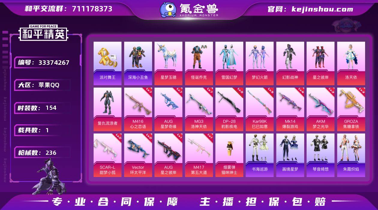 苹果【男神号/素材号 粉装-怪诞乔克,粉装-雪国幻梦,粉装-梦幻火箭,套装-派对舞王,角色-洛天依,416-心之恋语(七级),GROZA-焦糖拿铁(三级),AUG-星之彼岸(一级),AUG-星梦奇缘(七级),星梦玉骢,萌熊伴侣背包(3级)】 手Q-7粉装-19特效枪-1载具-5粉色飞行器-76312热力值-10王牌印记-154套装-236枪皮 【热门品类】:粉装-怪诞乔克,粉装-雪国幻梦,粉装-梦幻火箭,套装-派对舞王,套装-深海小丑鱼,套装-小丑鱼,角色-军刀雅典娜,套装-龟仙人 【粉色套装】:粉装-幻影战神,粉装-怪诞乔克,粉装-雪国幻梦,粉装-梦幻火箭,粉装-星之彼岸,角色-洛天依,角色-复仇流浪者 【粉色枪皮等级】:AKM-梦之光华(三级),SCAR-L-甜梦小狐(二级),M416-心之恋语(七级),GROZA-焦糖拿铁(三级),AUG-星之彼岸(一级),AUG-星梦奇缘(七级),Vector-环太平洋(二级),Kar98K-巳巳如意(五级),Mk14-爆裂游戏(四级),Mk14-福马献瑞(五级),M417-第五大道(一级),AA12-G-萌骑幻想(二级),DP-28-豹影疾电(五级),MG3-洛神天依(七级),M338-回旋牧梦使(三级),撬棍-小舞(二级),燃烧瓶-薄荷可可(三级),破片手榴弹-贪吃小熊(四级) 【粉色载具】:星梦玉骢 【粉色枪皮】:AKM-梦之光华,SCAR-L-甜...