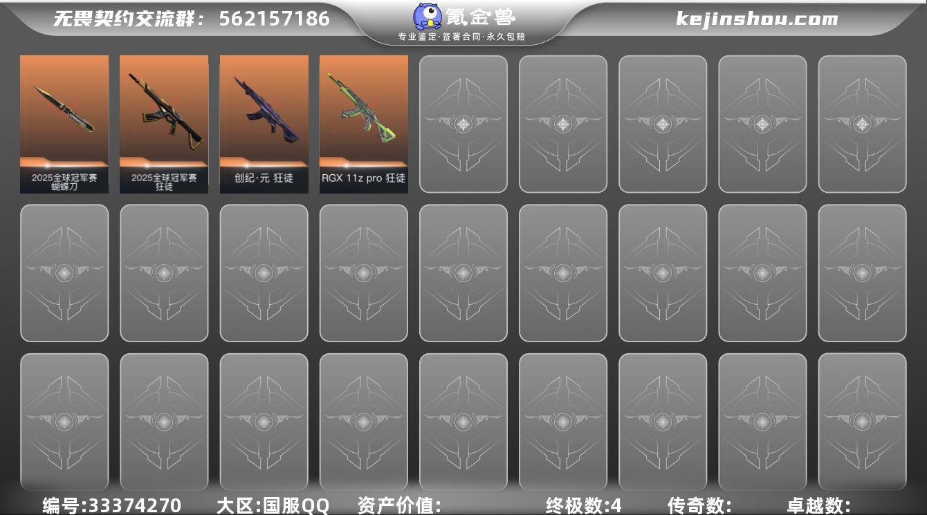 【套装】:2025全球冠军赛套装 【英雄】:炼狱,暮蝶,壹决,捷风,不死鸟,贤者,猎枭,芮娜,尚勃勒,霓虹,夜露,海神 【近战武器】:近战武器-2025全球冠军赛 蝴蝶刀 【狂徒】:狂徒-2025全球冠军赛,狂徒-创·纪元,狂徒-RGX 11z Pro 【卡面】:南瓜盛典 卡面,无畏契约GO!第一卷:芮娜 卡面,清除名单 卡面,无畏契约GO!第一卷:零 卡面,代号红色 卡面,新兵报到 卡面,V契约 卡面,无畏契约 卡面 【喷漆】:新潮流 喷漆,买装还是存钱 喷漆,胜利属于无畏契约 喷漆,GLHF 喷漆,无畏契约 喷漆 【挂饰】:天外飞客 挂饰,无畏契约 纪念币 挂饰