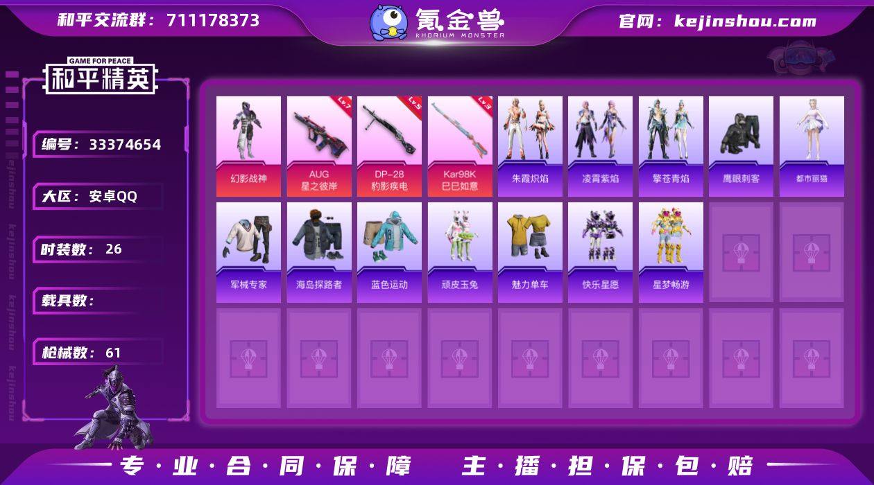 【HPN2231】粉装1/粉枪4/珍稀飞行器130245/套装26/枪皮61/热力值16305/历史最高段位:王牌印记0次/Lv:26/七级AUG-星之彼岸/三级Kar98K-巳巳如意/五级Mk14-福马献瑞/五级DP-28-豹影疾电/幻影战神/AUG星之彼岸/Kar98K-巳巳如意/Mk14-福马献瑞/DP-28-豹影疾电/炫彩糖果飞行器/星之彼岸降落伞/洛神天依降落伞/金丰海韵降落伞/冷漠罗丽降落伞/炫彩糖果降落伞/镜花水月降落伞/炫彩糖果/套装-马上有钱/都市丽猫/朱霞炽焰/凌霄紫焰/擎苍青焰/AKM-影袭/AKM-星之彼岸/SCAR-L-夜灯/GROZA-影袭/M762-第五大道/G36C-星穹咏叹调/ARX-凌霄紫焰/UMP45-夜灯/UMP45-生命誓言/UMP45-极意拳锋/Vector-金玉无双/汤姆逊-像素花束/JS9-凌霄紫焰/Kar98K-影袭/VSS-星之彼岸/S1897-炫彩节奏/S12K-夜灯/M249-星之彼岸/MG-36-凌霄紫焰/P92-凌霄紫焰/爆炸猎弓-喜羊羊与灰太狼/平底锅-凌霄紫焰/军械专家/海岛探路者/蓝色运动/顽皮玉兔/魅力单车/鹰眼刺客/快乐星愿/星梦畅游/深海小丑鱼头盔(2级)