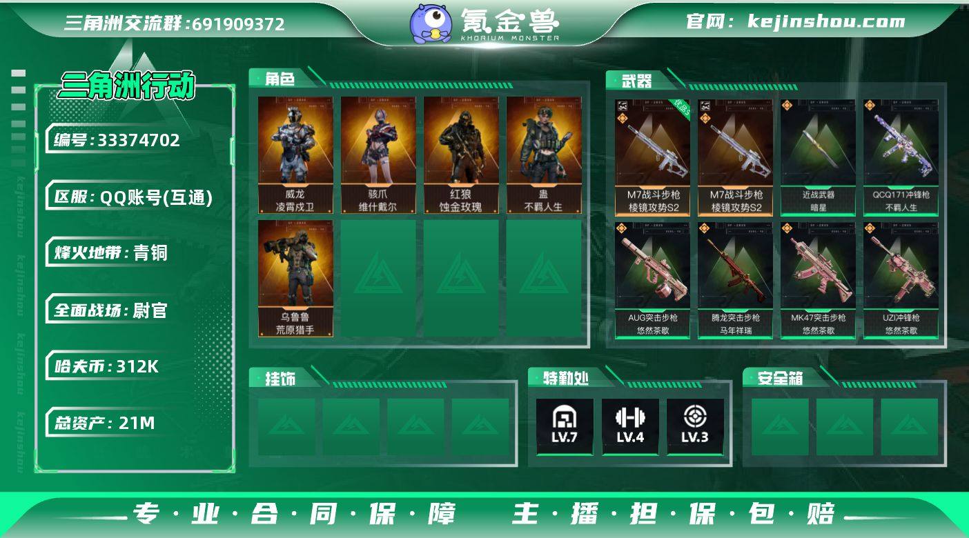 【SJZYT1029】总资产21M/哈夫币31万/传说近战数1/传说枪皮数21/战场等级32/行动等级60/安全箱等时效性道具以游戏内数据为准,详情请看图/红狼-蚀金玫瑰/骇爪-维什戴尔/威龙-凌霄戍卫/乌鲁鲁-荒原猎手/蛊-不羁人生/近战-暗星/近战-黑鹰/M7战斗步枪-棱镜攻势S2/优品S典藏武器外观-M7战斗步枪-棱镜攻势S2/M4A1突击步枪-蚀金玫瑰/AKM突击步枪-锦绣/QBZ95-1突击步枪-凌霄戍卫/K416突击步枪-行动记录/AUG突击步枪-悠然茶歇/SCAR-H战斗步枪-启航/腾龙突击步枪-马年祥瑞/腾龙突击步枪-万金泪冠/K437突击步枪-锦绣/MK47突击步枪-悠然茶歇/MK47突击步枪-暗星/UZI冲锋枪-悠然茶歇/SMG-45冲锋枪-锦绣/SR-3M紧凑突击步枪-暗星/勇士冲锋枪-万金泪冠/QCQ171冲锋枪-不羁人生/M14射手步枪-蛮荒/R93狙击步枪-维什戴尔/AWM狙击步枪-万金泪冠/G18-马年祥瑞/SVD狙击步枪-檀劫铳影/K416突击步枪-腊梅/K416突击步枪-阿萨拉特攻/SCAR-H战斗步枪-囚徒/K437突击步枪-丛林谍踪/MP5冲锋枪-深海恐惧/Vector冲锋枪-猎鳄行动/SMG45冲锋枪-阿萨拉特攻/SR-3M紧凑突击步枪-开工大吉/勇士冲锋枪-丛林谍踪/MP7冲锋枪-六套之力/PKM通用机枪-阿萨拉特攻/M249轻机枪-丛林谍踪/VSS射手步枪-丛林谍踪/SV98狙击步枪-猎鳄...