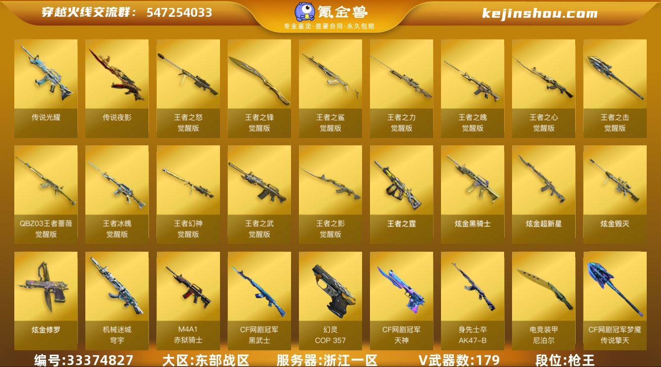浙江一区-198V-20王者武器数-4炫金武器数 【传说武器】:传说光耀,传说夜影 【热门武器】:传说光耀,传说夜影,QBZ03-金色蔷薇,Scar Light-白虎,HK417-朱雀,M200-幻神,死亡之眼,荣耀世冠-火麒麟,荣耀世冠-雷神,荣耀世冠-柯尔特,Kar98K-星神,牛牛-AK47,M4A1-黑骑士*5,汤姆逊-烈龙*6,RPK-盘龙,加特林-炼狱*6,斯泰尔-蝴蝶,雷神-小红,火麒麟-绝迹,USP-雷暴,COP-堕天神*2,COP 357-幻灵,沙鹰-修罗*7,荣耀世冠-龙啸,金刚伞 【王者炫金武器】:王者之霆,王者之魄高爆手雷,王者之魄闪光弹,烟雾弹-雷霆王者,闪光弹-雷霆王者*2,炫金骑士,炫金超新星,炫金毁灭,炫金修罗 【音效卡】:屠龙-动感闪耀 音效卡,天神-动感闪耀 音效卡,M200-幻神音效卡,AK47-火麒麟音效卡*3,M4A1-雷神音效卡,M4A1-黑骑士音效卡,Barrett-毁灭音效卡,AWM-裁决音效卡,AWM-昌龙-怀旧音效卡*3,N9语音包 【皮肤】:幻神-周瑜皮肤,幻神-冠军之幻,幻神-动感闪耀 皮肤,星神-漫游,裁决-流光秘银,QBZ03-嘉年华柯基,雷神-暗月,雷神-荣耀之魄,雷神-星空*3,雷神-烈虎皮肤,雷神-维纳斯皮肤,雷神-动感闪耀 皮肤,AK47-火麒麟-传奇EVEN,火麒麟-轻羽皮肤,火麒麟-百城,火麒麟...