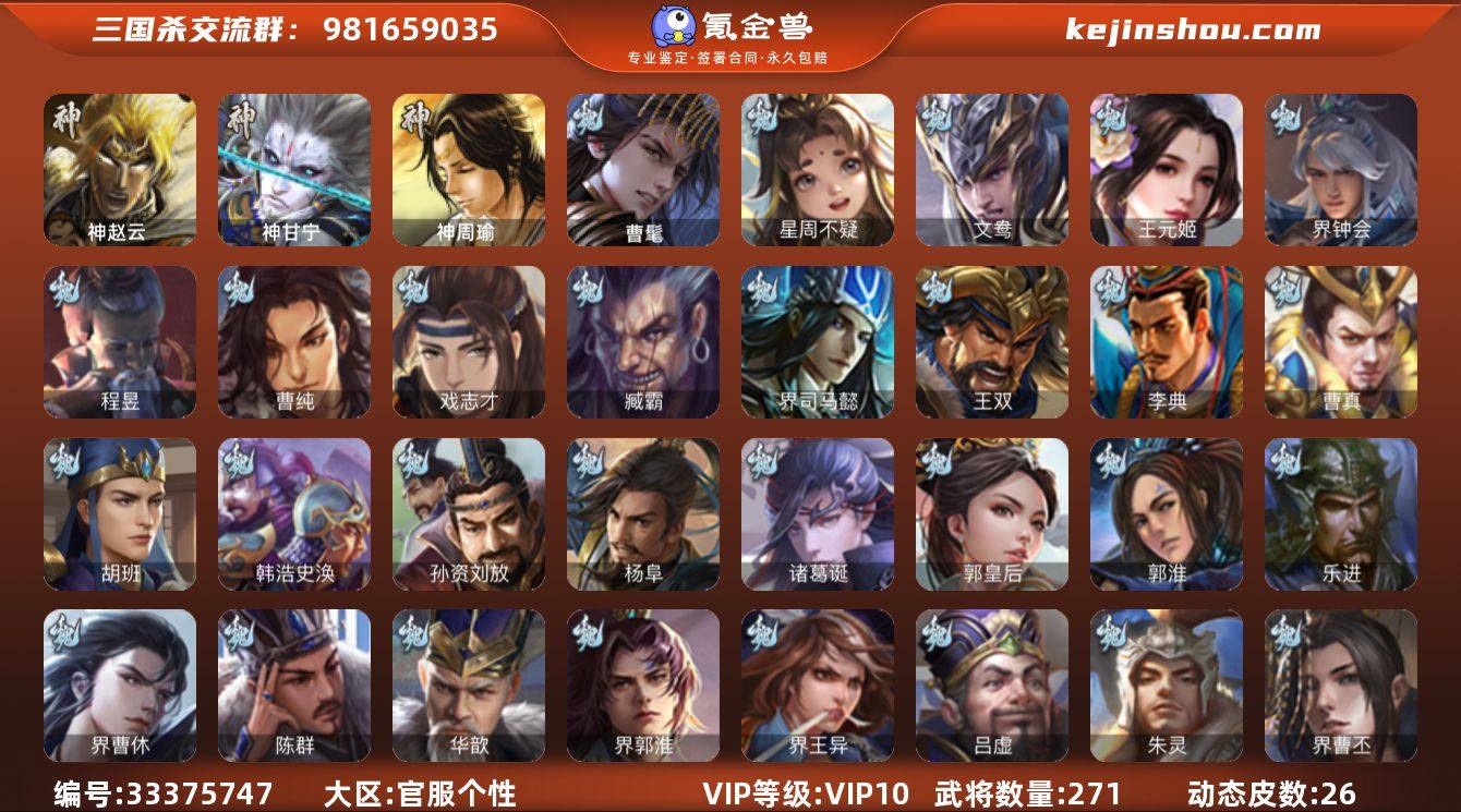 官阶:骠骑将军;VIP等级:VIP10;史诗武将数量:27;动态皮肤数量:26;武将总数:271;史诗宝珠数量:25;将魂数量:6275;神将:2;魏国史诗武将:12;蜀国史诗武将:5;吴国史诗武将:7;群史诗武将:8
