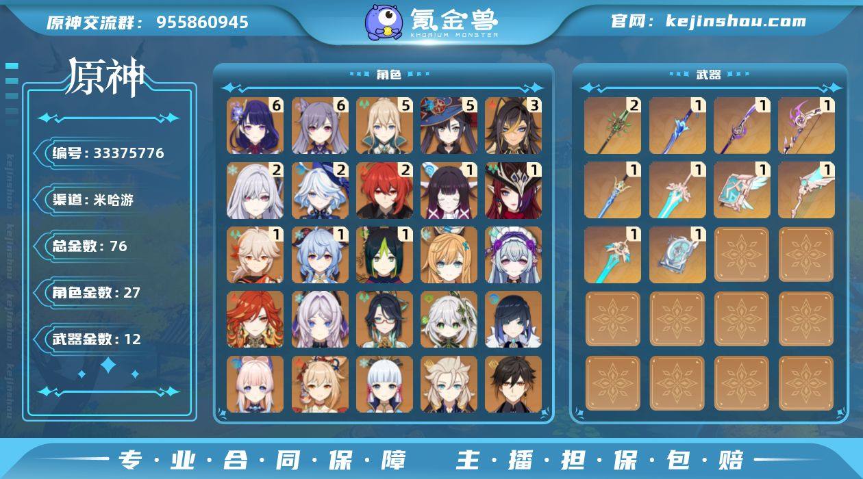 邮箱: 未绑定 总黄数: 76 冒险等级: 60 6命金色角色: 满命刻晴,满命雷电将军 5命金色角色: 五命莫娜,五命琴 3命金色角色: 三命迪希雅 2命金色角色: 二命迪卢克,二命芙宁娜,二命丝柯克 1命金色角色: 一命枫原万叶,一命甘雨,一命提纳里,一命恰斯卡,一命哥伦比娅 0命金色角色: 温迪,神里绫华,宵宫,七七,钟离,阿贝多,珊瑚宫心海,夜兰,纳西妲,闲云,玛薇卡,茜特菈莉,梦见月瑞希,爱可菲 拥有武器: 天空之翼,飞雷之弦振,四风原典,天空之卷,和璞鸢,天空之傲,天空之刃,薙草之稻光,苍古自由之誓,波乱月白经津 2精武器: 和璞鸢 1精武器: 天空之翼,飞雷之弦振,四风原典,天空之卷,天空之傲,天空之刃,薙草之稻光,苍古自由之誓,波乱月白经津