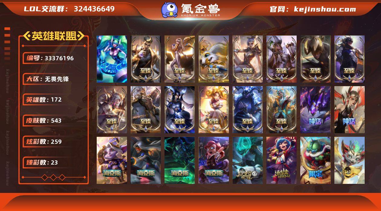 【956529】未定级段位-172英雄-543皮肤-259炫彩-1终极-22神话-91限定-57传说-134史诗 【神话皮肤】:十周年纪念安妮,源代码乐芙兰,殿堂传奇乐芙兰,神凰行者瑞羽圣凰艾尼维亚,水晶掠夺者卡兹克 【至臻皮肤】:至臻魅惑女巫厄运小姐,至臻黑夜使者李青,至臻天龙之子伊泽瑞尔,至臻玉剑传说武剑仙锐雯,至臻绒毛菲兹,至臻T1杰斯,至臻青花瓷丽桑卓,至臻女帝黛安娜,至臻KDA卡莎,至臻真实伤害赛娜,至臻DRX亚托克斯,至臻源计划逆流塞拉斯,至臻星之守护者妮蔻 【海克斯皮肤】:海克斯科技安妮,新创战纪希维尔,海克斯科技崔丝塔娜,摄魂使者薇恩 【臻彩皮肤】:神龙烈焰金克丝珍珠龙息,天龙之子卡莎飞龙乘云,无畏骑士瑟庄妮赤子初心,冠军之箭艾希凯旋圣装,墨之影武者亚索金墨耀影,神龙尊者圣龙李青龙腾云起,神龙尊者圣龙李青登龙,西部魔影卢锡安贝利尔之怠,源计划联合艾希红莲之弓,幻灵战斗狼塞拉斯梦幻强袭,灵魂莲华亚索霜见之时,可爱可爱粉红红布里茨,殿堂传奇乐芙兰登神,魔女阿卡丽虚荣,净雪之月莫甘娜冬虹,红莲之刃锐雯,心之钢伊泽瑞尔天纵才华 【年限皮肤】:古琴余韵娑娜,神龙烈焰金克丝,张辽文远,王国机神苍狼瑟提,天龙之子斯莫德 【情人节...