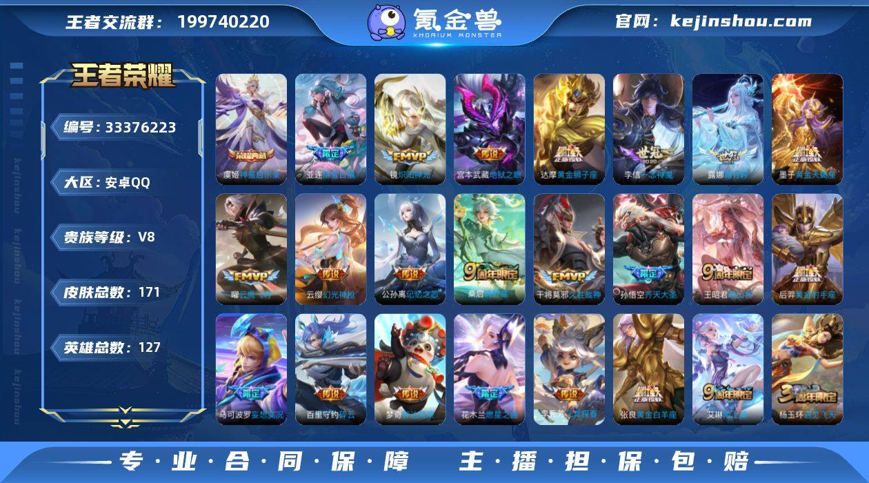 安卓Q 可二次 1典藏32传说127英雄171皮肤 神鉴启示录 群星魔术团云中君 黄金天蝎座 落雪白狼 曦玄引吕布 曦玄引貂蝉 乘龙铭钟鼎 逐花归海 铠琥珀纪元 马超琥珀纪元 幻光神枪 鸣野蒿 映山客 启明星使 冥王哈迪斯 齐天大圣 燃星之曲 霜月吟 妄想实况 记忆之芯 碎云 炽阳神光 云鹰飞将 久胜战神 一念神魔 黄金狮子座 黄金射手座 黄金白羊座 超时空战士男 飞鸢探春 胖达荣荣 时之恋人男 地狱之眼 谪仙醉月 银河之约 冰冠公主 龙鼓争鸣 陌上桑 东方月初 涂山红红 战舞者 心动手记海诺 群星魔术团上官婉儿 燃音魔法 伽罗琥珀纪元 匿光破解者 天秀启明 水晶猎龙者 暗隐猎兽者 猫狗日记女 金属风暴 特工魅影 特工战影 心灵战警 遇见飞天 乱世虎臣 鹰眼统帅 魔术师 王者荣耀账号