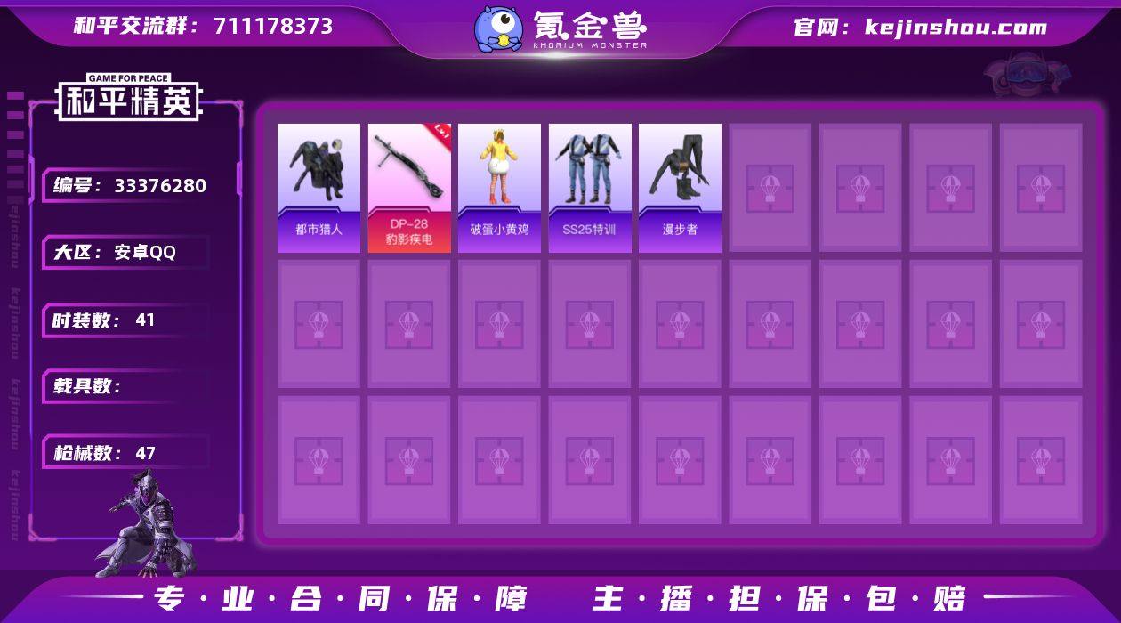 M1047642【可二次都市猎人】安卓手Q-1特效枪-41套装-47枪皮-2王牌印记-英勇黄金Ⅰ-12638热力值【1特效枪】DP-28-豹影疾电[4级]【1稀有】都市猎人【1飞行器】粉色滑翔尾迹【1头盔】深海小丑鱼头盔【86其它衣服和枪皮】都市漫游者,热血青春,破晓战魂,SS21特训,白色伏地魔,探宝勇士,六六大吉,灼焰舞者,福星高照,冷焰舞者,青年教官,薄荷星砂,SS37特训,SS25特训,耀眼新星,SS20特训,特训学院,疯狂小兔子,特战装甲,破蛋小黄鸡,SS35特训,猛禽,魅力单车,蓝色运动,牛气冲天,SS19特训,SS22特训,SS23特训,甜蜜告白,战术大师,萌鸡速递,SS36特训,幻世战舞者,元素星魂,漫步者,海盐绵绵冰,黄色名流,竞技名士,战地督导,柠萌假日,Mini14-耀粉歌者,M762-天降萌叽,UZI-炫彩节奏,GROZA-福马献瑞,Mk47-乌木金纹,DBS-圣堂之誓,莫辛纳甘-乌木金纹,AUG-耀粉歌者,M16A4-幻世战舞者,Vector-生命誓言,破片手榴弹-拽到爆炸,破片手榴弹-呆爆全场,SCAR-L-海盐豹豹,S12K-幻世战舞者,SLR-彩虹符号,AWM-天降萌叽,汤姆逊-耀粉歌者,MG3-乌木金纹,AKM-破晓战魂,Kar98K-彩虹符号,M24-炫彩节奏,AUG-紫晶流影,撬棍-幻世战舞者,M416-蓝色火焰,Mk14-薄荷星砂,SKS-炫彩节奏,汤姆逊-天降萌叽,SCAR-L-红色方程式,UMP45-生命誓...