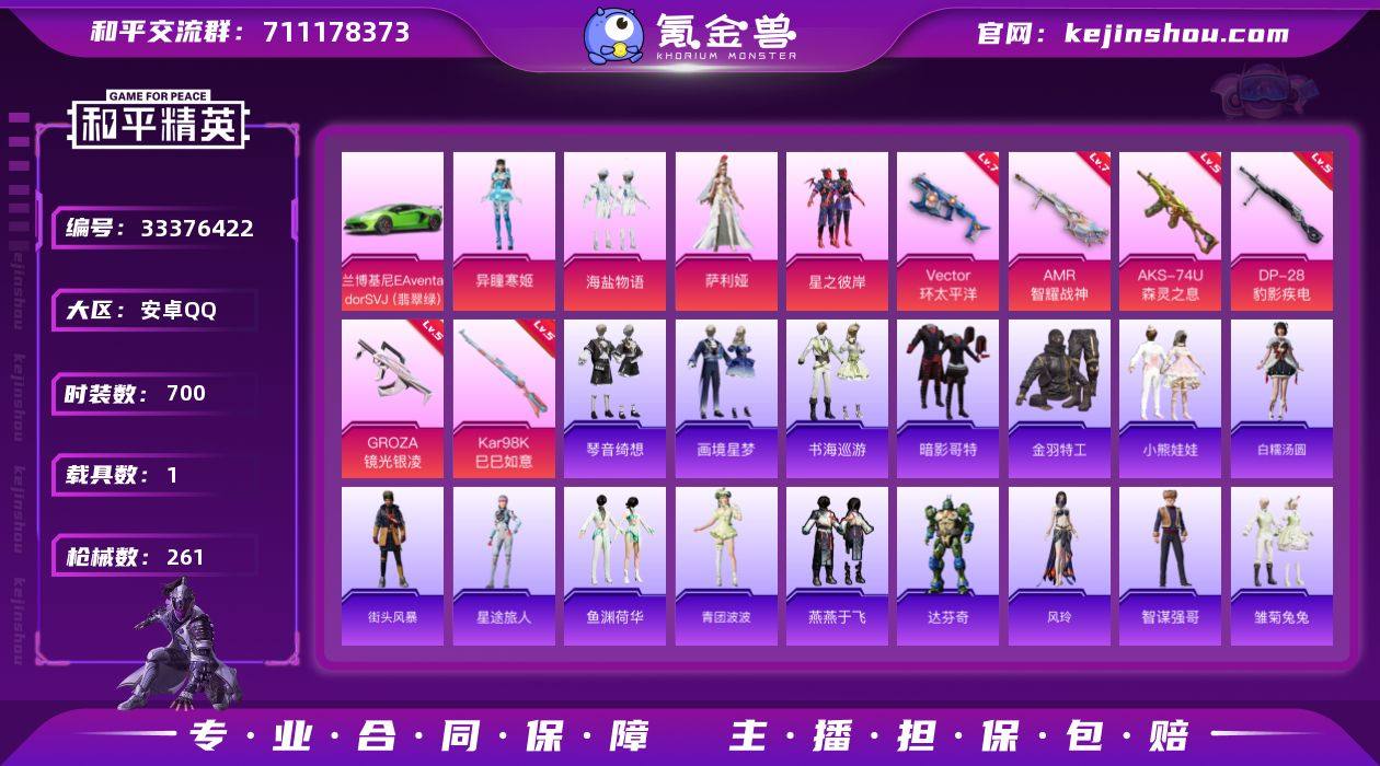 【特价出售】QQ钱包无法注销安卓Q-1稀有1载具4粉装9特效枪13热门187套装261枪皮 73438热力值 10印记 历史传奇王牌20星 【1稀有】 AWM-黄金龙骨 【1载具】 兰博SVJ绿色 【4粉装】 萨利娅 异瞳寒姬 星之彼岸 海盐物语 【9特效枪】 AKS-74U-森灵之息 (5级) Kar98K-巳巳如意 (5级) DP-28-豹影疾电 (5级) AMR-智耀战神 (7级) GROZA-镜光银凌 (5级) Mk14-福马献瑞 (5级) UMP45-萌骑冒险 (5级) ACE32-萌骑漫游 (5级) Vector-环太平洋 (7级) 【13热门】 龟仙人 暗夜之虎 青涩年华 鹰眼刺客 暗夜之虎 金羽特工 暗影哥特 粉红小猪 漫步者 破蛋小黄鸡 极速红龙 军刀雅典娜 英勇保护者 【1飞行器】 星之彼岸飞行器