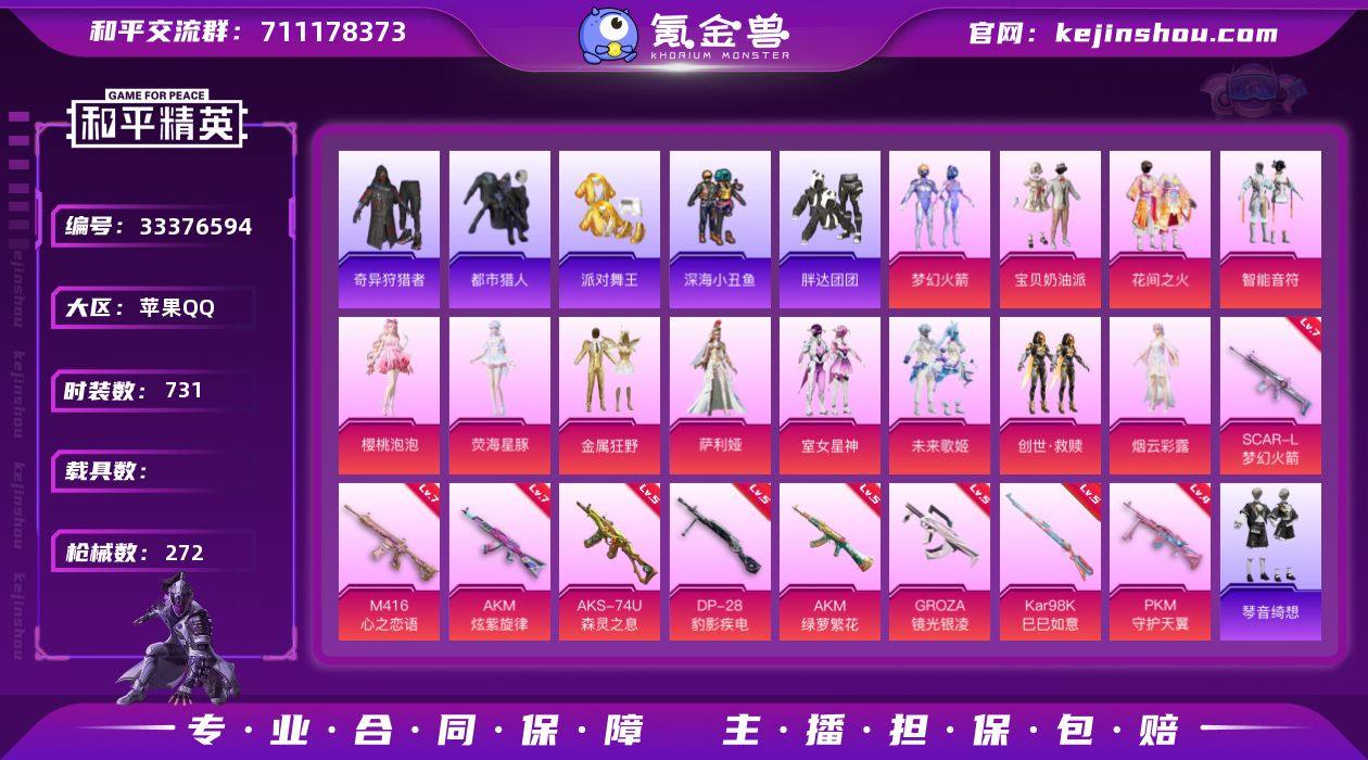 【特价出售】苹果Q-6稀有13粉装11特效枪20热门198套装272枪皮 84819热力值 16印记 历史无敌战神 【6稀有】 奇异狩猎者 AWM-黄金龙骨 都市猎人 浪漫天命 派对舞王 派对舞王(金靴子) 【13粉装】 梦幻火箭 萨利娅 宝贝奶油派 虎痴许褚 荧海星豚 烟云彩露 樱桃泡泡 未来歌姬 创世救赎 室女星神 金属狂野 智能音符 花间之火 【11特效枪】 SCAR-L-梦幻火箭 (7级) M416-心之恋语 (7级) AKM-炫紫旋律 (7级) AKS-74U-森灵之息 (5级) AKM-绿萝繁花 (5级) Kar98K-巳巳如意 (5级) DP-28-豹影疾电 (5级) PKM-守护天翼 (4级) GROZA-镜光银凌 (5级) Mk14-福马献瑞 (5级) ACE32-萌骑漫游 (5级) 【20热门】 龟仙人 暗夜之虎 2P战斗服款 红熊茄茄 鹰眼刺客 激萌罗小黑 暴走罗小黑 暗夜之虎 迅捷狂鲨 深海小丑鱼 胖达团团 KONE追光队服 AG战队服 JDE战队服 LGD战队服 暗影哥特 忍者信条 水银刺客 漫步者 AUG-魔法学院 【2飞行器】 梦幻火箭飞行器 镜光幻境飞行翼 【4头盔】 国宝胖达头盔 梦幻火箭头盔 金羽特工头盔 甜蜜誓约头盔 【5背包】 梦幻火箭背包 甜心宝贝背包 萌熊伴侣背包 金羽特工背包 花间之火背包